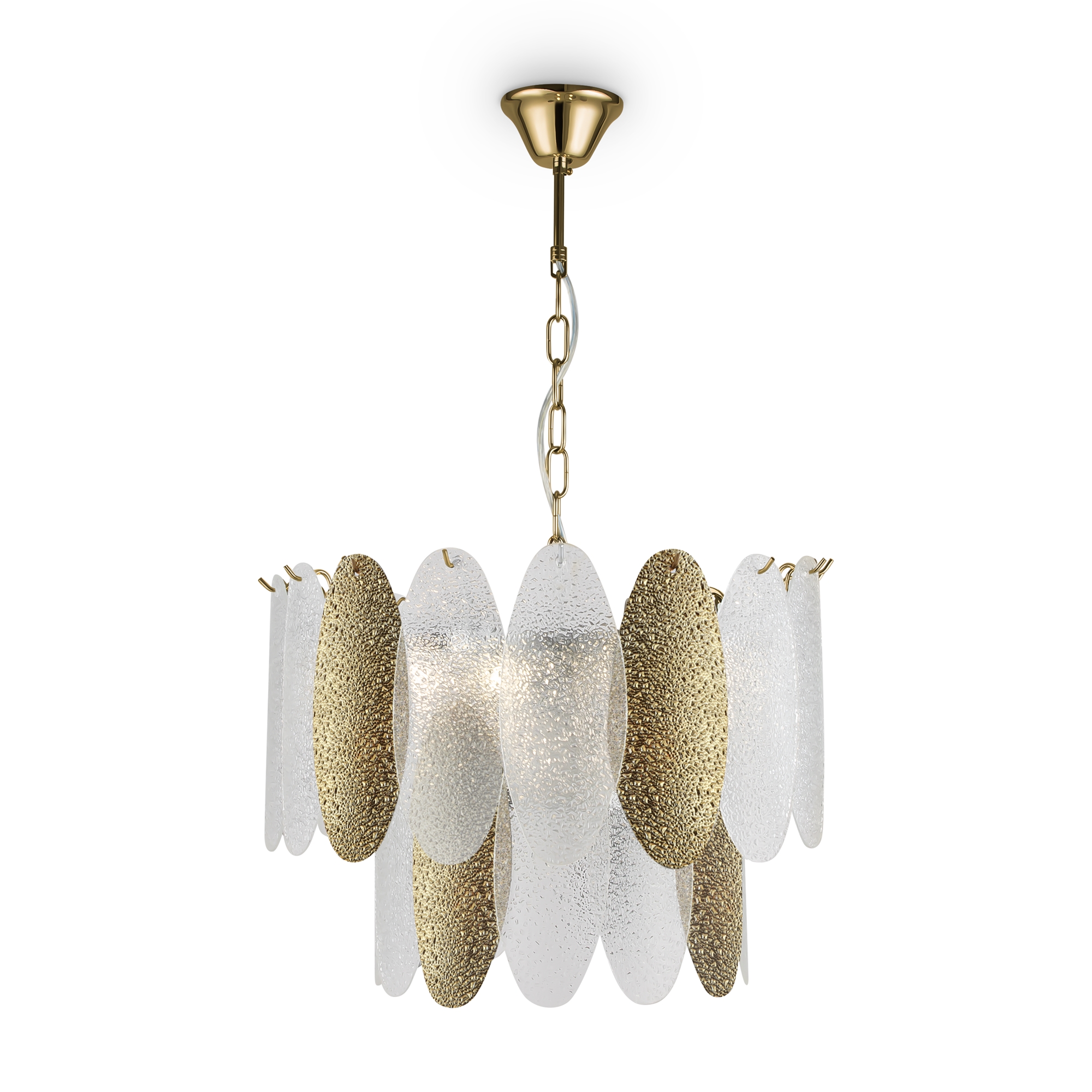 Сложность и в то же время утонченность фактурного декора – уникальная особенность серии Demure. Металлическая арматура светильника окрашена в цвет хрома. Источники света обрамляют вытянутые пластины – овальные лепестки, формирующие гармоничный и изящный силуэт. Мягкий свет, струящийся сквозь фактурный декор, напоминает блики морских волн. Водная гладь преломляется и отражается в пластинах, образуя переливы. Серия включает люстру и бра, что позволяет организовать комплексное освещение в гостиной, спальне и любых жилых пространствах. Современные формы модели актуальны для различных стилей – от элегантной неоклассики и торжественного ар-деко до фьюжн и эклектики.