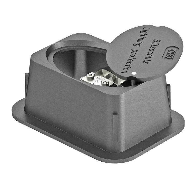 без дна из чугуна черного цвета с установленным разделительным зажимом для круглых проводниковRd 8-10 и плоских проводниковдо FL 40 в соответствии со стандартомVDE 0185-561-5 (ГОСТ Р МЭК 62561.5-2014) подходит для усиленных нагрузок(доs 40 кН/ 4,0 тонн).