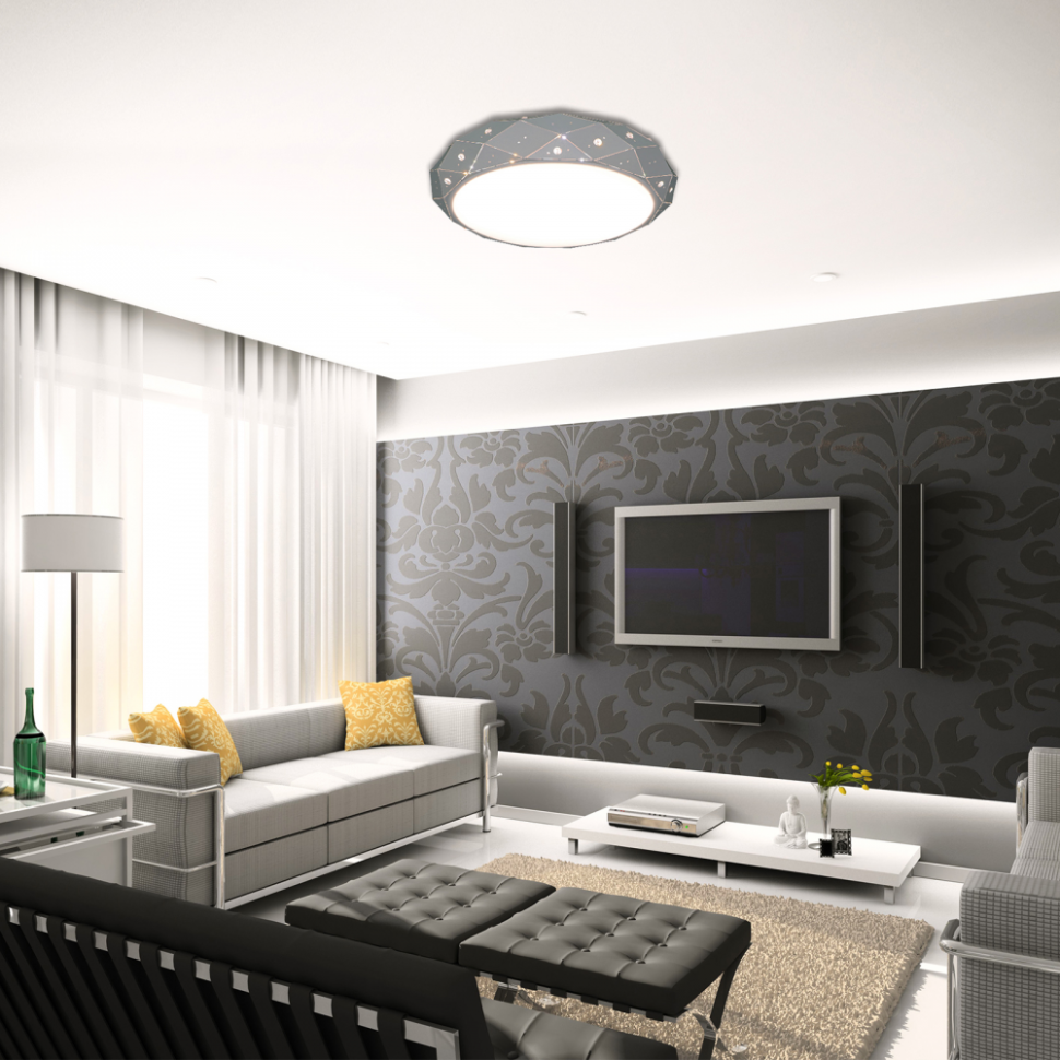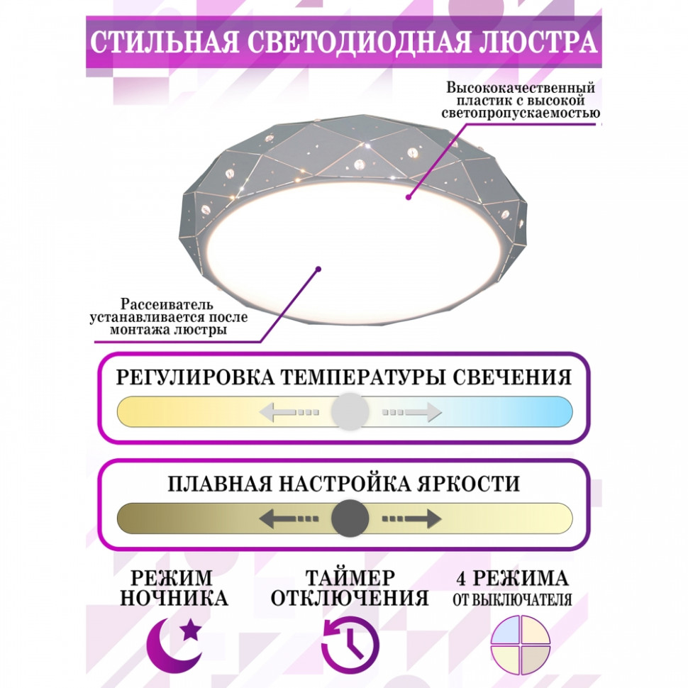 Светодиодный светильник с дистанционным управлением через пульт ДУ, смартфон, планшет. Основная часть люстры выполнена из металла с выраженными гранями. Боковые грани имеют симметричный узор с тиснением, через который проходит свет. Стеклянные элементы, расположенные по периметру, эффектно переливают свет. Дизайн люстры выполнен в современном стиле в сером цвете и отлично подойдёт в любой интерьер. Люстра имеет тёплый, естественный и холодный свет с регулировкой температуры свечения. Обладает плавной настройкой яркости в диапазоне от 10% до 100%. Имеется режим ночника и таймер отключения. Кроме того, от стандартного выключателя люстра имеет 4 режима свечения. Данные функции делают светильник оптимальным в процессе использования. Общая мощность 80W со световым потоком 6400 lm позволяет осветить до 16 кв.м. Он прост в сборке, установке и экономичен в обслуживании. Светодиоды легко заменимы в случае перегорания. Люстра подойдёт для всех видов потолков. Цветовая температура настраивается от 2700 до 7000 K. Степень защиты 20 IP.