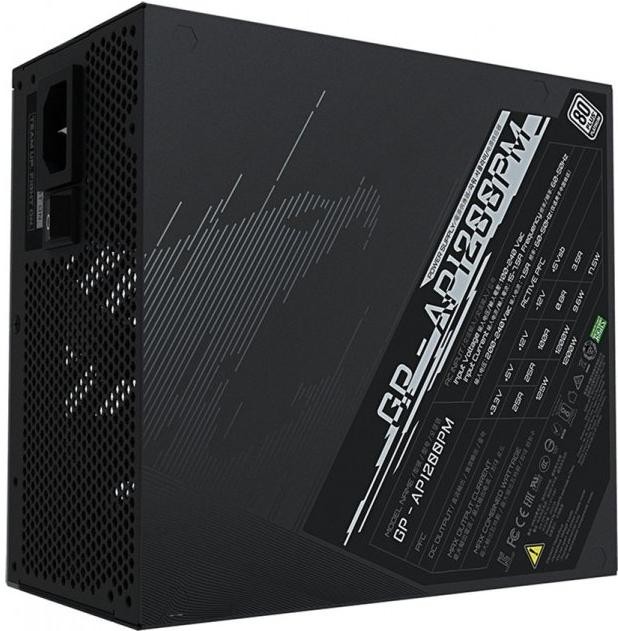 Модель БП Aorus GP-AP1200PM повністю модульна, має сертифікат 80 PLUS Platinum (ККД не нижче 92 % під навантаженням) і оснащена однією лінією 12 В. За охолодження компонентів блоку живлення, у складі яких присутні японські конденсатори, відповідає 140-мм вентиля. автоматичного очищення від пилу. Розміри новинки становлять 150 х 160 х 86 мм.