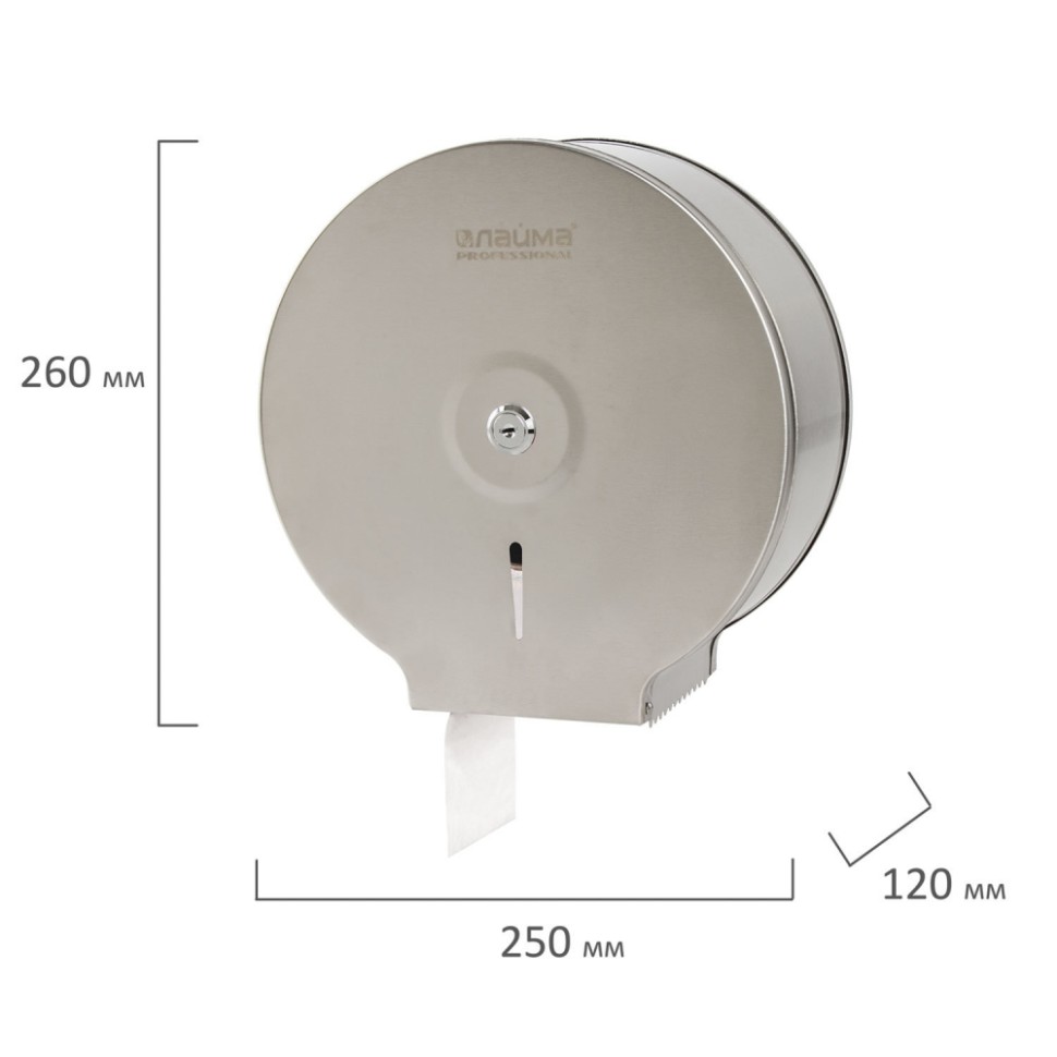 Диспенсер из матовой нержавеющей стали. Оптимальное решение для туалетных комнат с большой проходимостью. Предназначен для удобной подачи профессиональной туалетной бумаги в рулонах. Универсальный дизайн будет идеально выглядеть в любом помещении. Вид расходных материалов: рулонный с втулкой. Артикул: 605048. Серия: нет. Система : T2. Антивандальный корпус: да. Вместимость: 1 пач./рулонов. Контроль остатка бумаги: да. Тип закрывания: металлический ключ. Удобные зубцы для бесконтактного отрыва бумаги: да. Комплектация: крепежные материалы, лекало для установки. Материал замка: металл. Материал корпуса: металл. Цвет корпуса: нержавеющая сталь (матовый). Ширина: 250 мм. Высота: 260 мм. Глубина: 120 мм Бренд - ЛАЙМА. Производитель - Китай. Артикул - 605048. Штрихкод - 4606224199474
