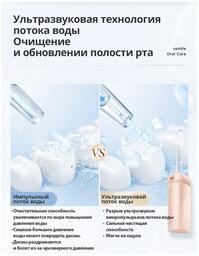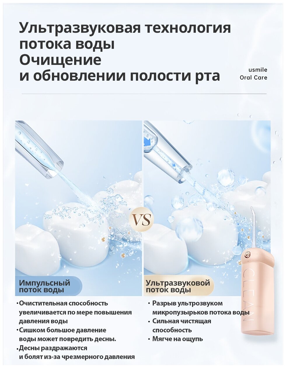 Ирригатор Usmile CY1 Flosser позволит более эффективно очищать полость рта без раздражений и дискомфорта. Мощная струя удалит мягкий налет и остатки пищи с зубов и из промежутков между ними. Уход с помощью этого прибора поможет снизить вероятность возникновения заболевания десен за счет массирующего воздействия, улучшающего местное кровообращение. Владельцу устройства доступны четыре режима: массажный - для профилактики, мягкий - для новичков, обычный и интенсивный - для тотальной очистки. В комплекте с ирригатором Usmile CY1 Flosser Pink можно найти три насадки, рассчитанные на высокое давление. Первая - стандартная, вторая - деликатная, подходит для чувствительных зубов. Профессиональный наконечник, дополненный щеткой, позволяет очистить брекеты. Устройство работает от собственного аккумулятора, заряда которого хватает на 90 дней регулярного использования. Резервуар для жидкости объемом 180 мл съемный, поэтому его легко очищать от накипи. Во избежание перегрева ирригатор Usmile CY1 Flosser Pink автоматически отключается через две минуты. Прибор со степенью влагостойкости IPX7 способен выдерживать кратковременное погружение под воду. Устройство управляется с помощью кнопки, выбранный режим сопровождается индикацией. Благодаря компактным размерам аксессуар можно брать с собой в дорогу.