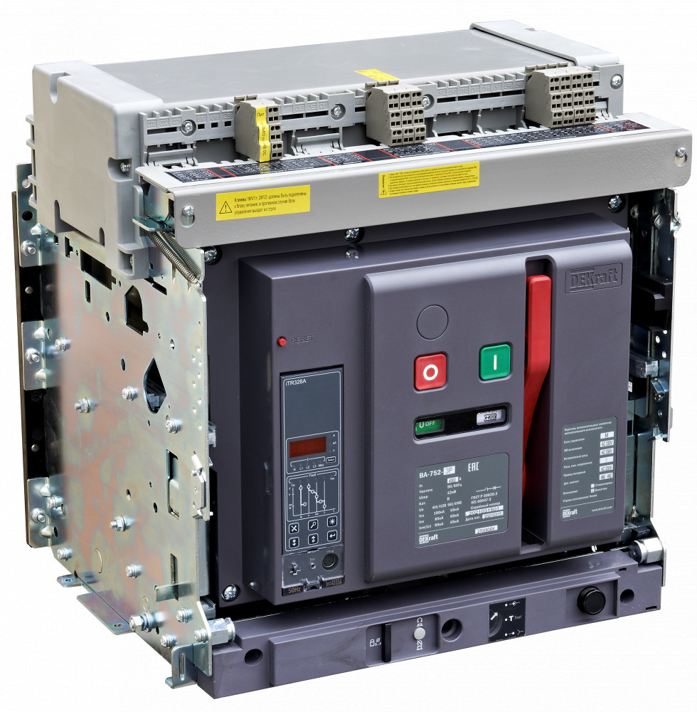 Воздушный автоматический выключатель серии ВА-752 DEKraft; 3P; номинальный ток 1600 А; отключающая способность 100 кА, стационарный, блок управления типа M; присоединения задние горизонтальные. В базовую комплектацию входят моторный привод (230 В пер.тока), 4 контакта состояния ВКЛ/ОТКЛ, сигнальный контакт, электромагнит включения (230 В пер.тока), независимый расцепитель (230 В пер.тока), сигнальный контакт положения аппарата в корзине, разделители полюсов и рамка передней панели.