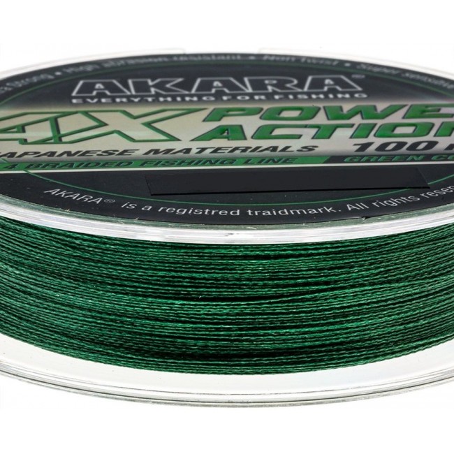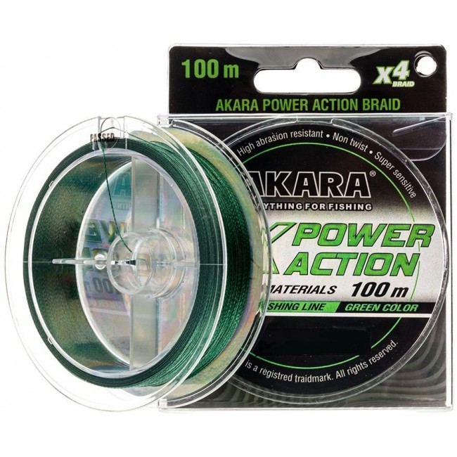 Akara Power Action X-4 - универсальный плетёный четырехжильный рыболовный шнур, выпускаемый под торговой маркой Akara. Шнур создан для того, чтобы удовлетворить потребности рыболовов в качественном, надежном, прочном и недорогом шнуре. Шнур зеленого цвета. Изготовлен из плотного волокна японского производства. Шнур отличается высокой прочностью и надежностью, имеет круглую форму, абразивоустойчив и подойдет практически для любых условий лова, в том числе для ловли в местах, где высока вероятность зацепов. Поставляется в намотках 135 метров. Диапазон диаметров от 0,08 до 0,2 мм при тесте от 5,5 до 15,1 кг. Шнур отличается высокой прочностью и надежностью, имеет круглую форму, абразивоустойчив и подойдет практически для любых условий лова, в что числе для ловли в местах, где высока вероятность зацепов. Поставляется в намотках 135 метров. Диапазон диаметров от 0,08 до 0,2 мм.артикул - APAX4GN-100-012