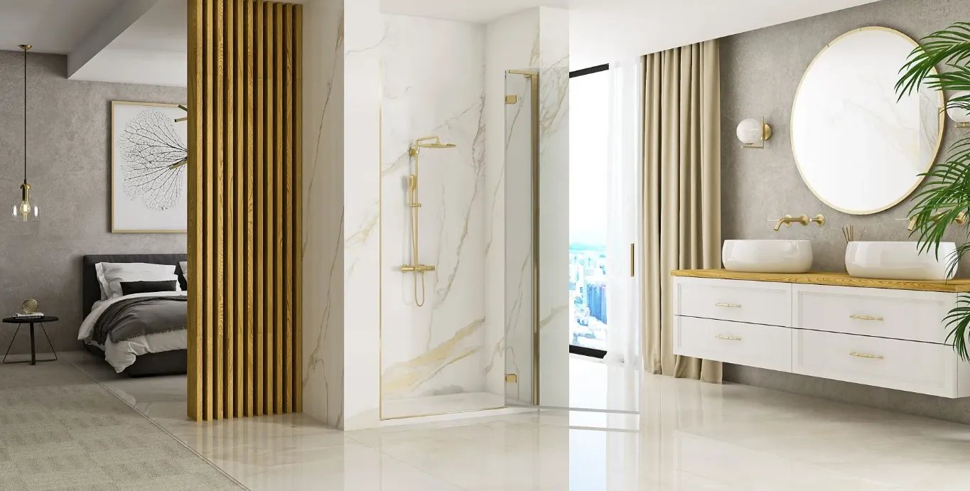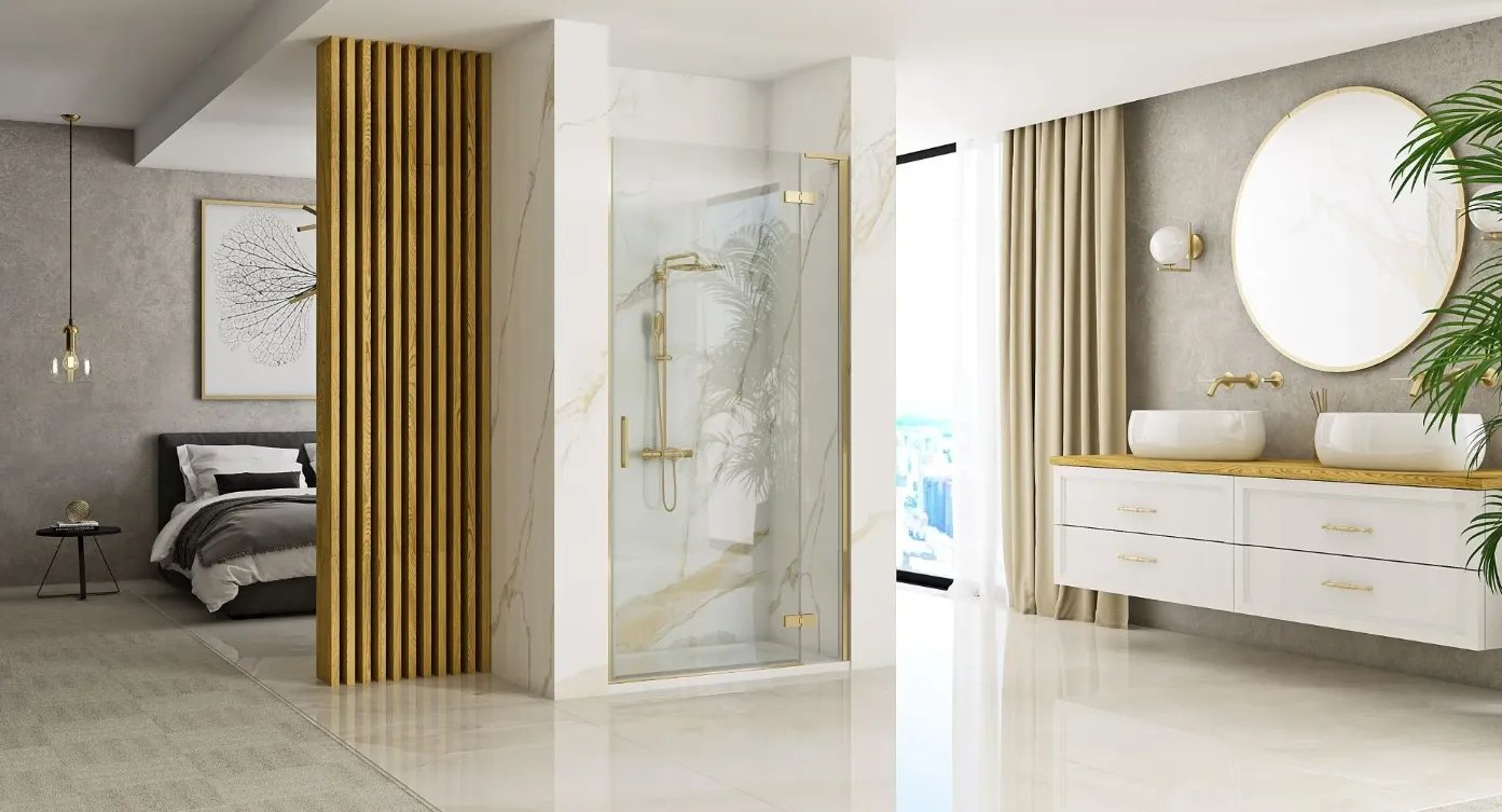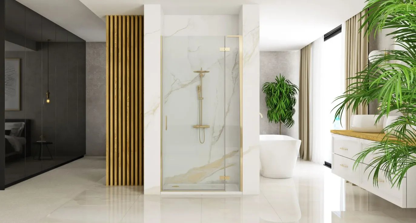 Душевая дверь Rea Hugo Brushed Gold 90x200 стекла прозрачные, профиль золото