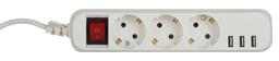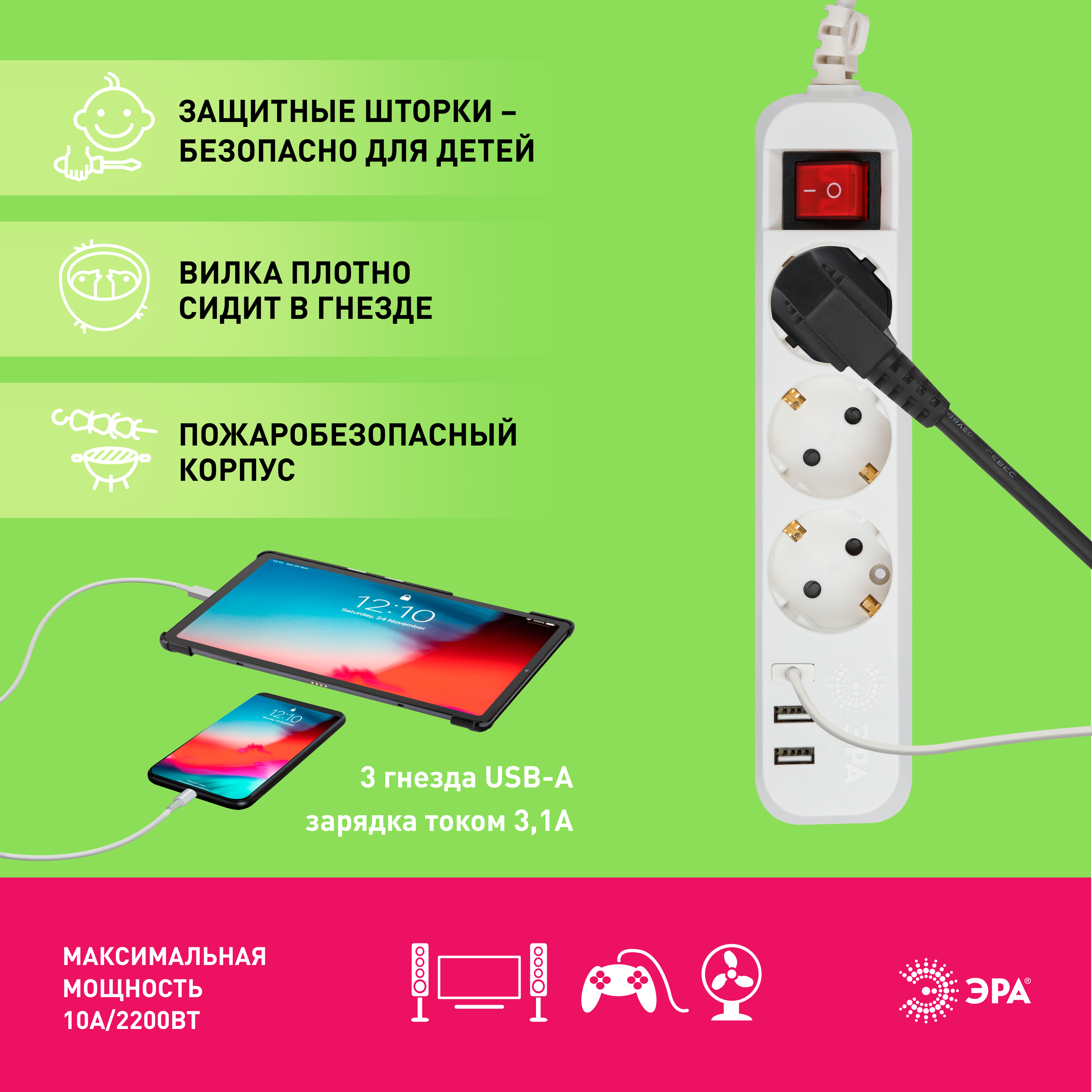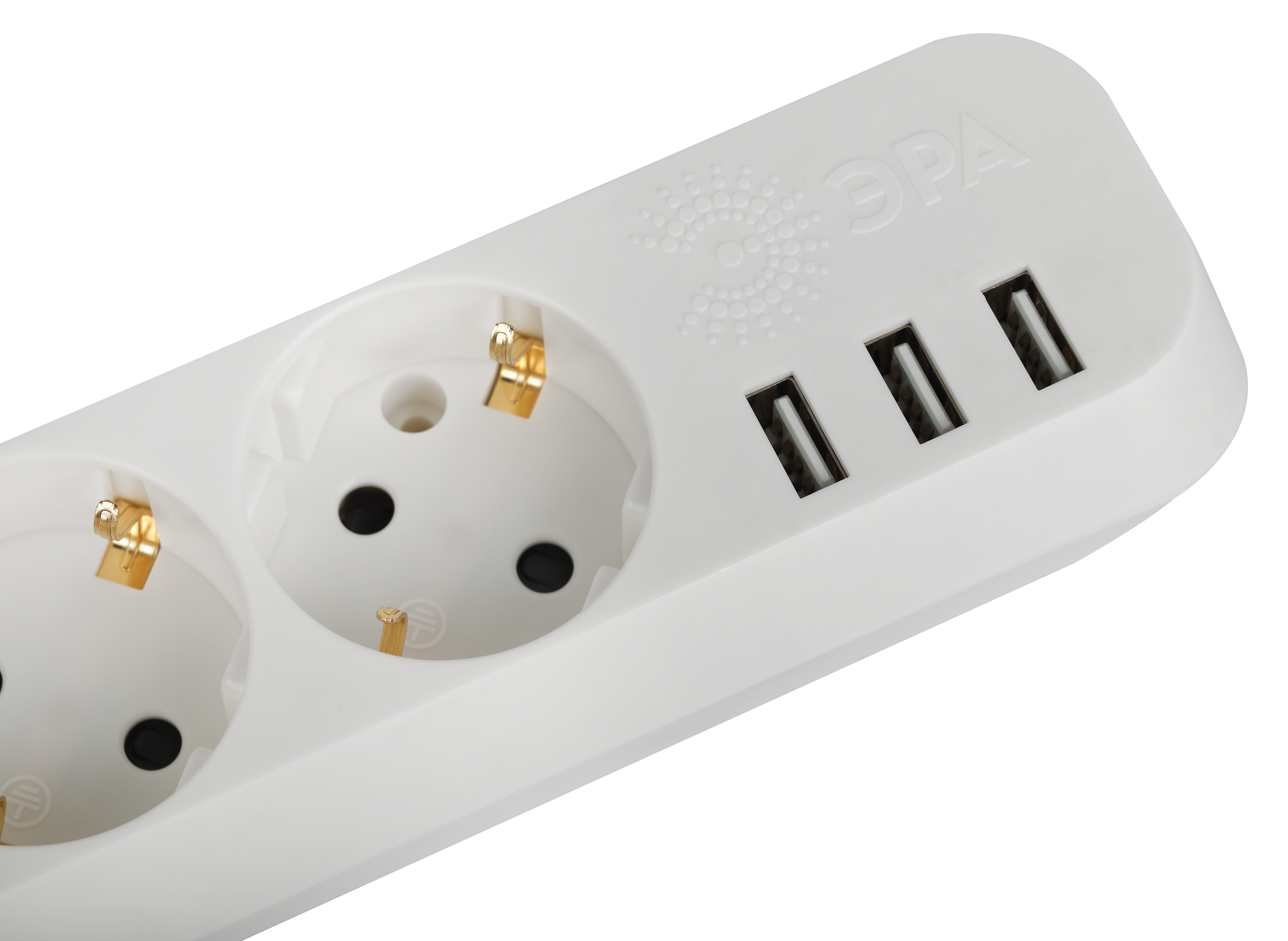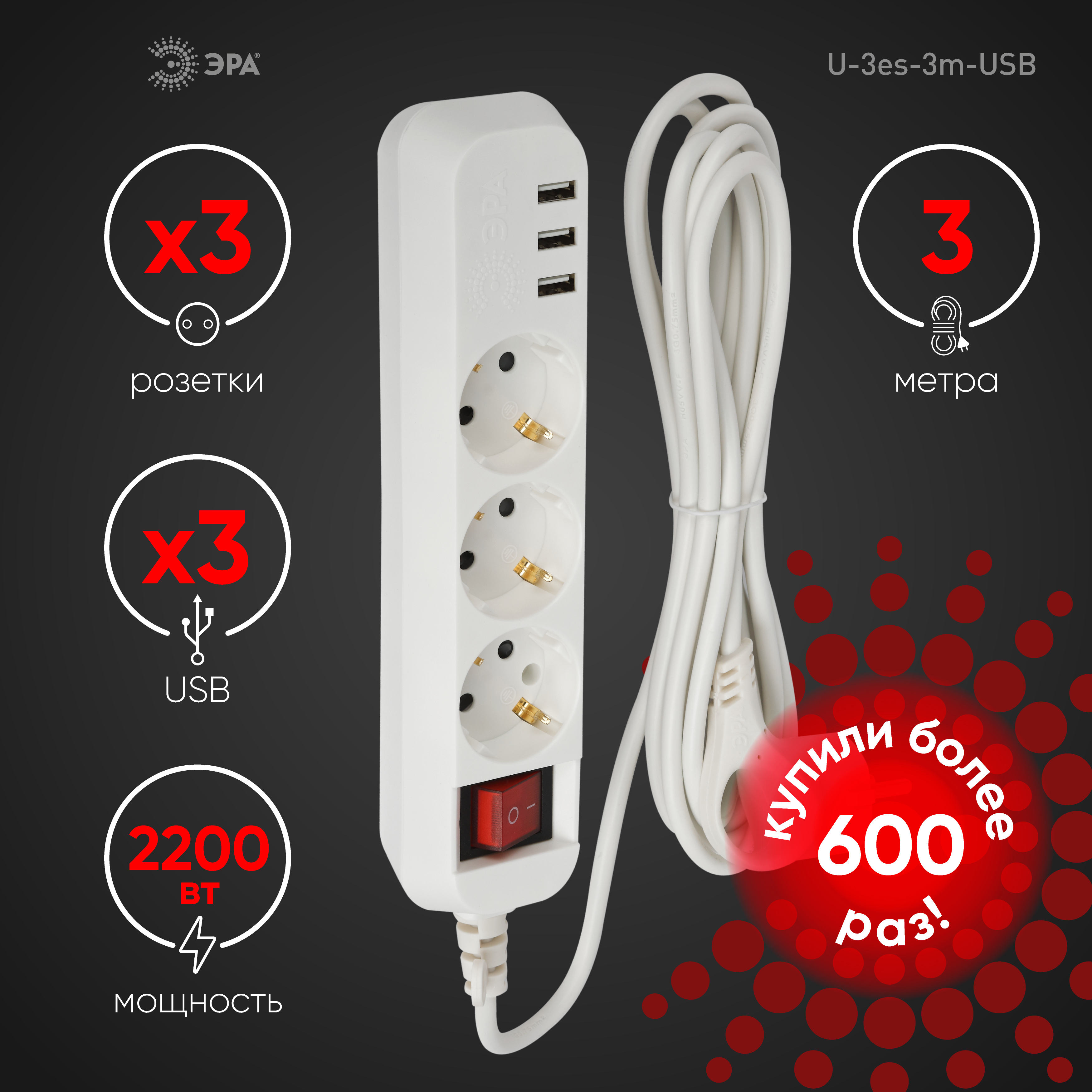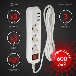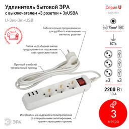 Удлинитель электрический ЭРА U-3es-3m-USB c заземлением с выключателем 3 розетки + 3xUSBA 3м 10А