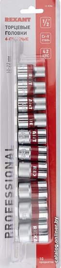 • Комплектация Набор торцевых головок REXANT 1/2, шестигранные:Головка торцевая, 10 мм: 1 шт.Головка торцевая, 12 мм: 1 шт.Головка торцевая, 13 мм: 1 шт.Головка торцевая, 14 мм: 1 шт.Головка торцевая, 15 мм: 1 шт.Головка торцевая, 16 мм: 1 шт.Головка торцевая, 17 мм: 1 шт.Головка торцевая, 19 мм: 1 шт.Головка торцевая, 21 мм: 1 шт.Головка торцевая, 22 мм: 1 шт.