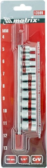 • Комплектация Набор универсальных торцевых головок 1/4" Spline, CrV 4-13мм