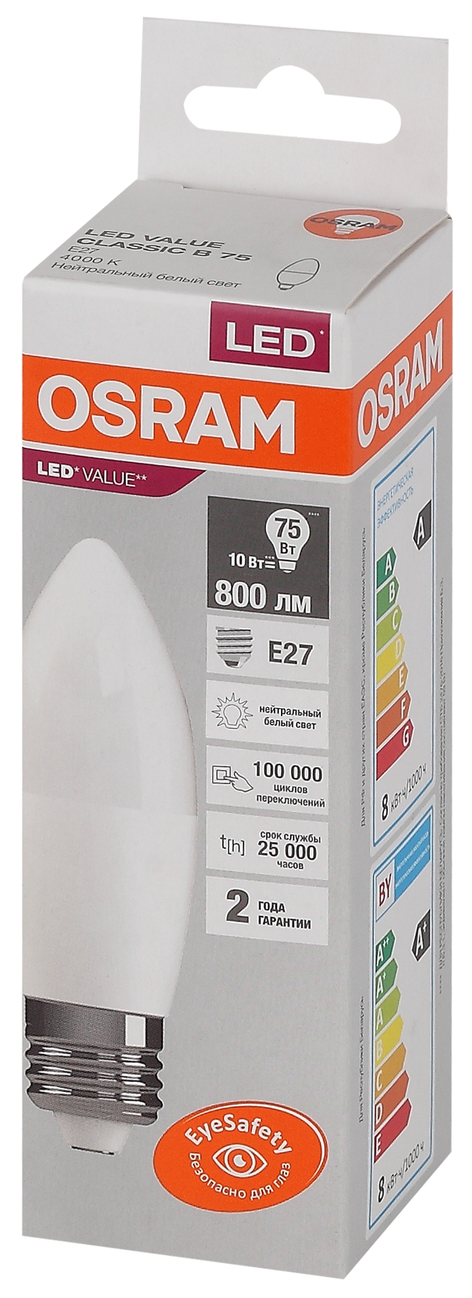 Лампа светодиодная OSRAM LED Value B, 800лм, 10Вт (замена 75Вт), 4000К (нейтральный белый свет). Цоколь E27, колба B, угол пучка 200. Исполнение колбы матовое, пластик. Напряжение питания 220-240В. Товар сертифицирован.