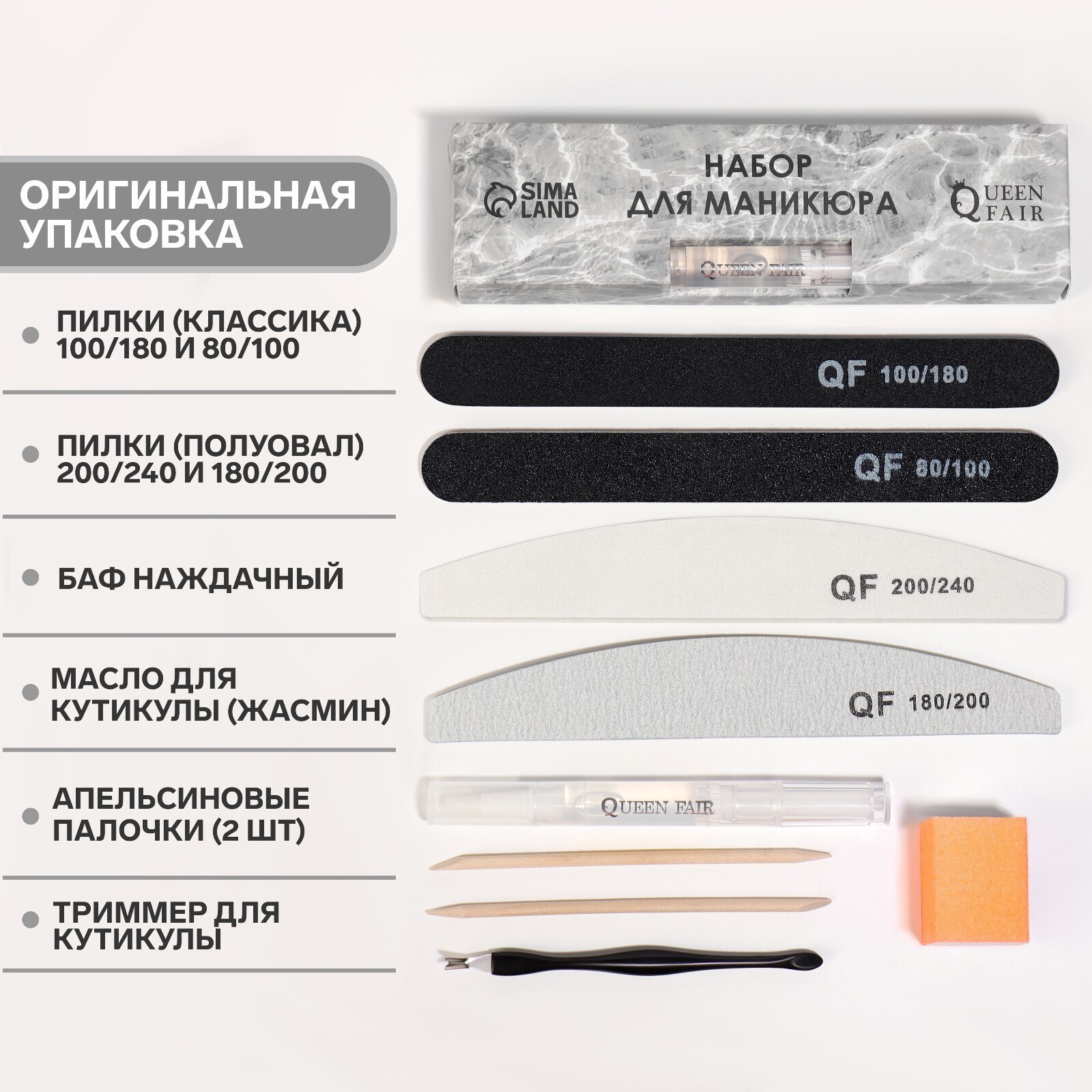 • Составляющие набора Апельсиновая палочка, Баф, Масло для кутикулы, Пилка, Триммер