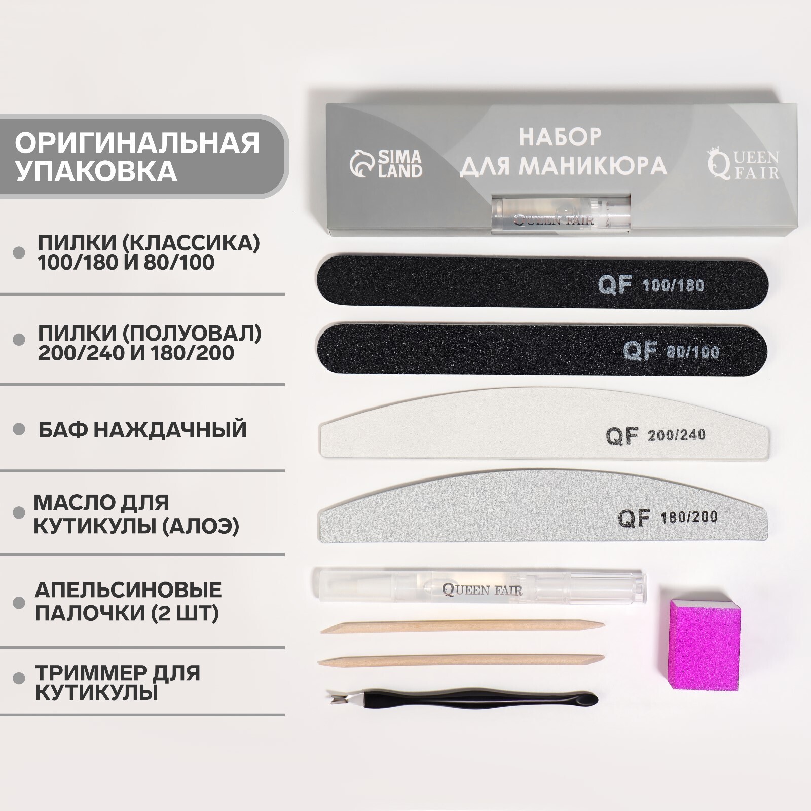 • Составляющие набора Апельсиновая палочка, Баф, Масло для кутикулы, Пилка, Триммер