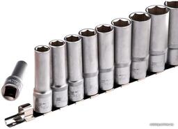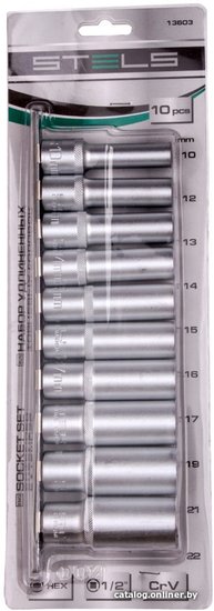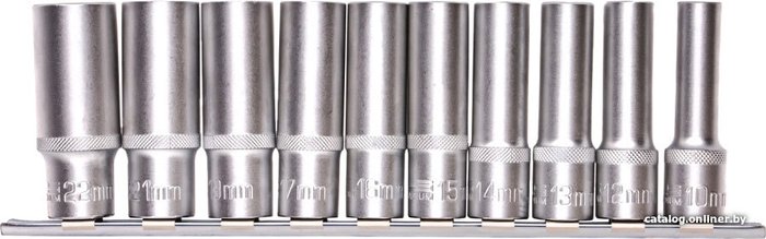 - Комплектация Набор удлиненных торцевых головок, шестигранные: 10 мм, 12 мм, 13 мм, 14 мм, 15 мм, 16 мм, 17 мм, 19 мм, 21 мм и 22 мм.