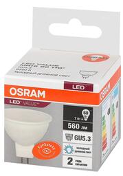 Лампа светодиодная OSRAM LED Value MR16, 560лм, 7Вт (замена 60Вт), 6500К (холодный белый свет). Цоколь GU5.3, колба MR16, угол пучка 110. Исполнение колбы матовое, пластик. Напряжение питания 220-240В. Товар сертифицирован.