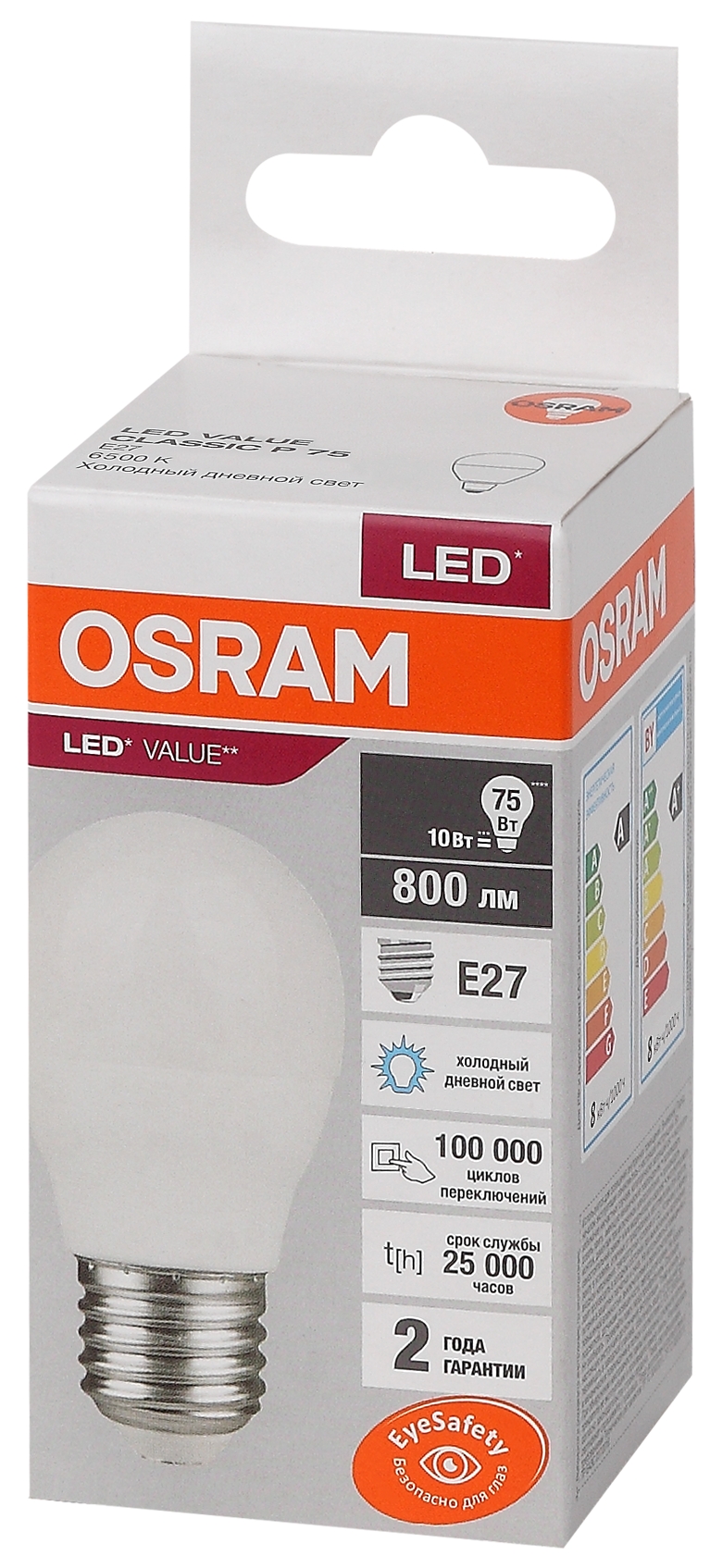 Лампа светодиодная OSRAM LED Value P, 800лм, 10Вт (замена 75Вт), 6500К (холодный белый свет). Цоколь E27, колба P, угол пучка 180°. Исполнение колбы матовое, пластик. Напряжение питания 220-240В. Товар сертифицирован.