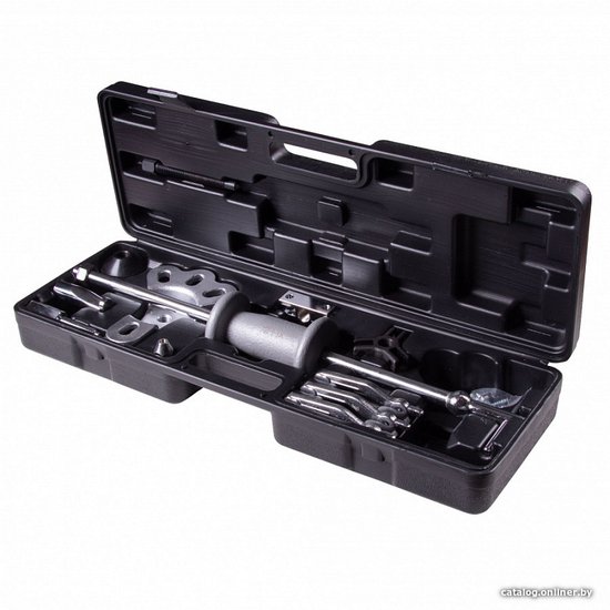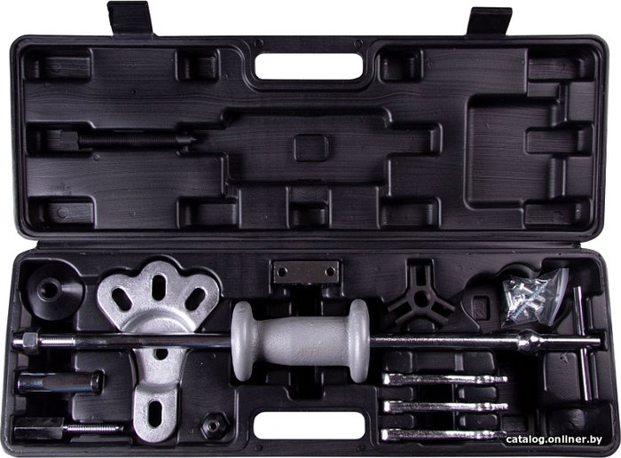 Назначение: демонтаж подшипников, полуосей, ступиц и других деталей и узлов методом выбивания с применением нагрузки обратного удара (обратный молоток).Комплектация:Ось молотка 580 ммМолот (боёк) чугунный 2 кгТри захвата (лапы) съёмника 100 ммКронштейн для двух-захватного съёмникаКронштейн для трёх-захватного съёмникаТри крепёжных болта и гайка для крепления захватовАдаптер М11 х 56 мм для выталкивателя, размер под ключ 21 ммАдаптер конусный для фиксации захватов, Ø 58 ммСъёмник ступицы, глубина 20 мм, разлёт 112-137 ммВыталкиватель-крючок 76,5 ммШуруп 50 мм для рихтовочных работАдаптер резьбовой для шурупа, размер под ключ 21 ммКейсНазначение: демонтаж подшипников, полуосей, ступиц и других деталей и узлов методом выбивания с применением нагрузки обратного удара (обратный молоток).Комплектация:Ось молотка 580 ммМолот (боёк) чугунный 2 кгТри захвата (лапы) съёмника 100 ммКронштейн для двух-захватного съёмникаКронштейн для трёх-захватного съёмникаТри крепёжных болта и гайка для крепления захватовАдаптер М11 х 56 мм для выталкивателя, размер под ключ 21 ммАдаптер конусный для фиксации захватов, Ø 58 ммСъёмник ступицы, глубина 20 мм, разлёт 112-137 ммВыталкиватель-крючок 76,5 ммШуруп 50 мм для рихтовочных работАдаптер резьбовой для шурупа, размер под ключ 21 ммКейс