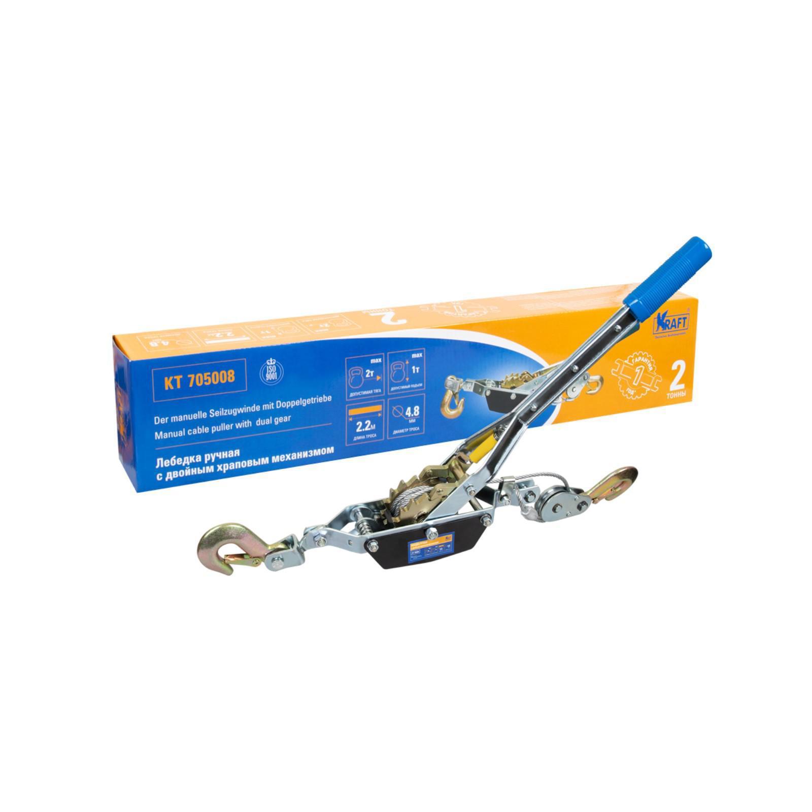 Лебедка ручная KRAFT KT705008, с двойным храповым механизмом, 2 т, 2.2 м, 2 крюка