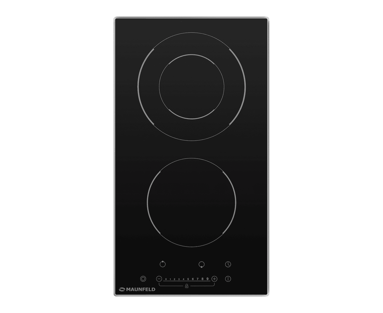 Компактная электрическая встраиваемая варочная панель на 2 конфорки шириной 30 см выполнена из ударопрочной стеклокерамики черного цвета с элегантной металлической окантовкой по периметру, которая служит для защиты от сколов на торцах и не дает жидкости, убежавшей при готовке попасть на столешницу. Поверхность устойчива к появлению царапин, легко очищается с помощью мягкой губки и моющего средства или специального скребка.