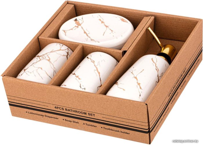 - Комплектация дозатор жидкого мыла, мыльница, стакан для зубных щеток, стакан косметический