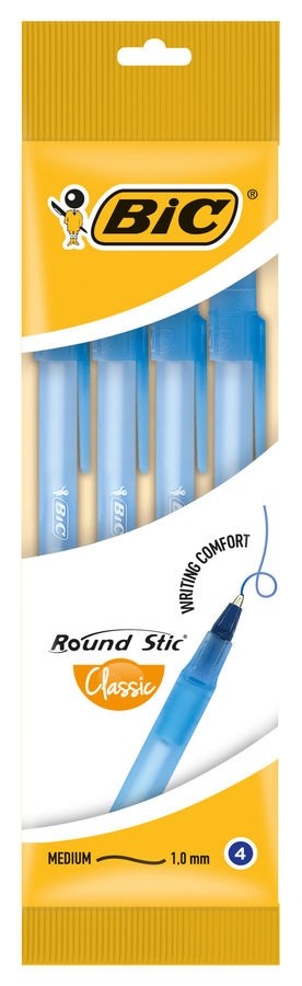 Ручки шариковые BIC "Round Stic", НАБОР 4 шт., СИНИЕ, узел 1 мм, линия письма 0,32 мм, пакет, 944176 (143975)