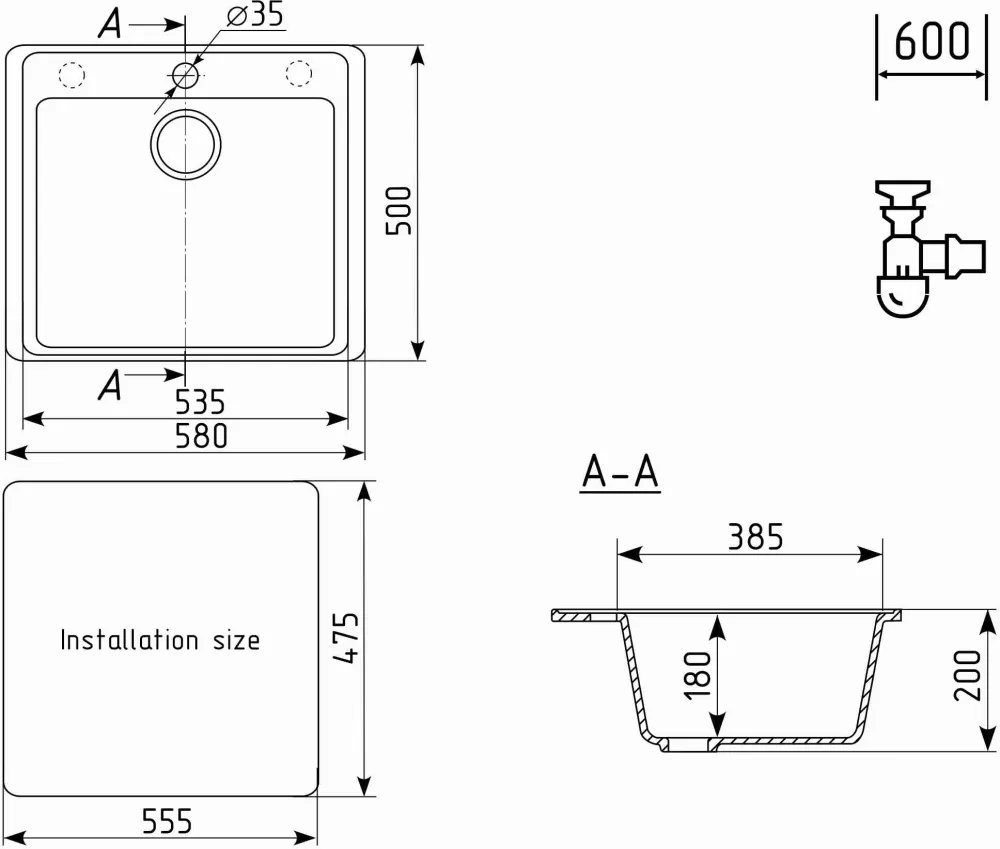 Способ установки врезная, форма прямоугольная, материал композитный материал, количество чаш 1, ширина 58 см, длина (диаметр) 50 см, глубина основной чаши 18 см.