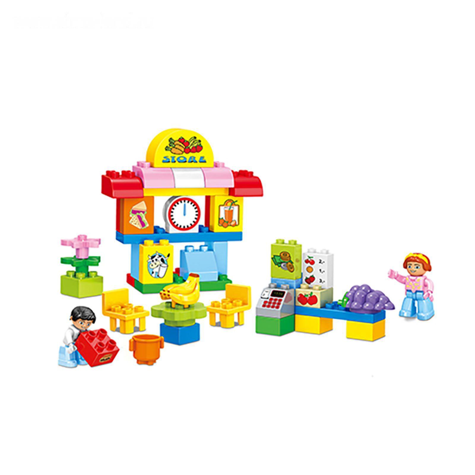С этим конструктором ребёнок построит собственный супермаркет. Из крупных блоков юный предприниматель соберёт прилавки с товарами, кассовый аппарат и буфетный столик с угощениями.