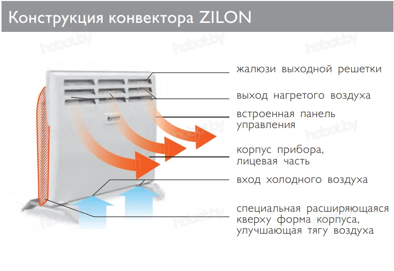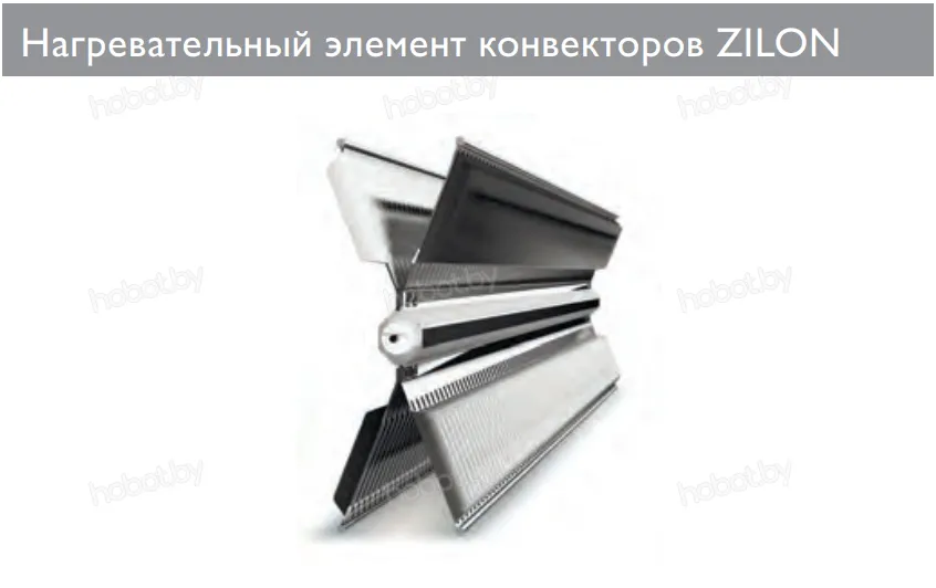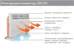 Работа конвекторов ZILON основана на принципе естественной конвекции: холодный воздух поступает внутрь обогревателя через отверстия в нижней части и, проходя через нагревательный X-образный нагревательный элемент, уже нагретый воздух выходит через жалюзи, расположенные на передней панели обогревателя.