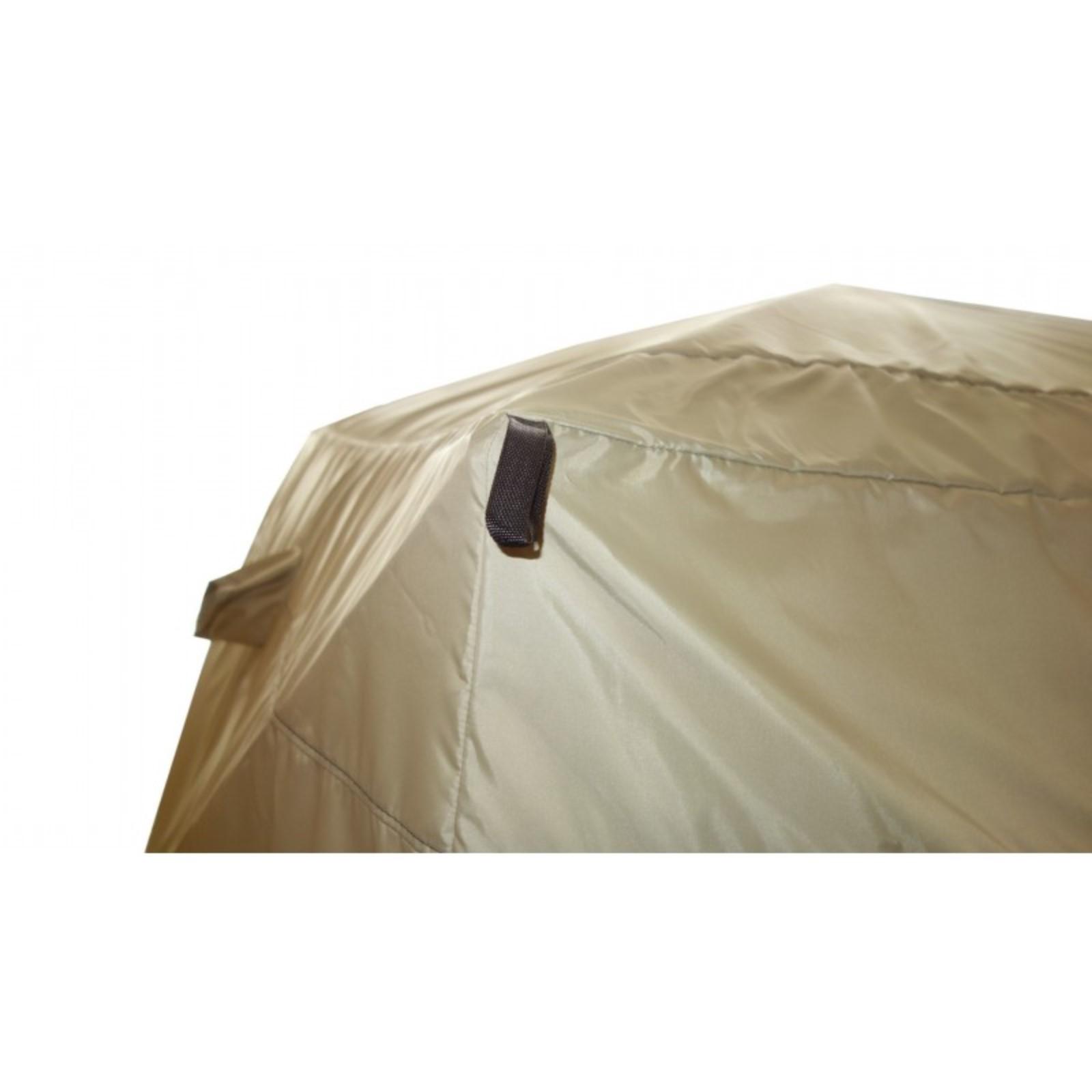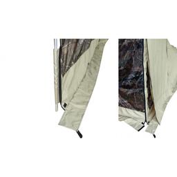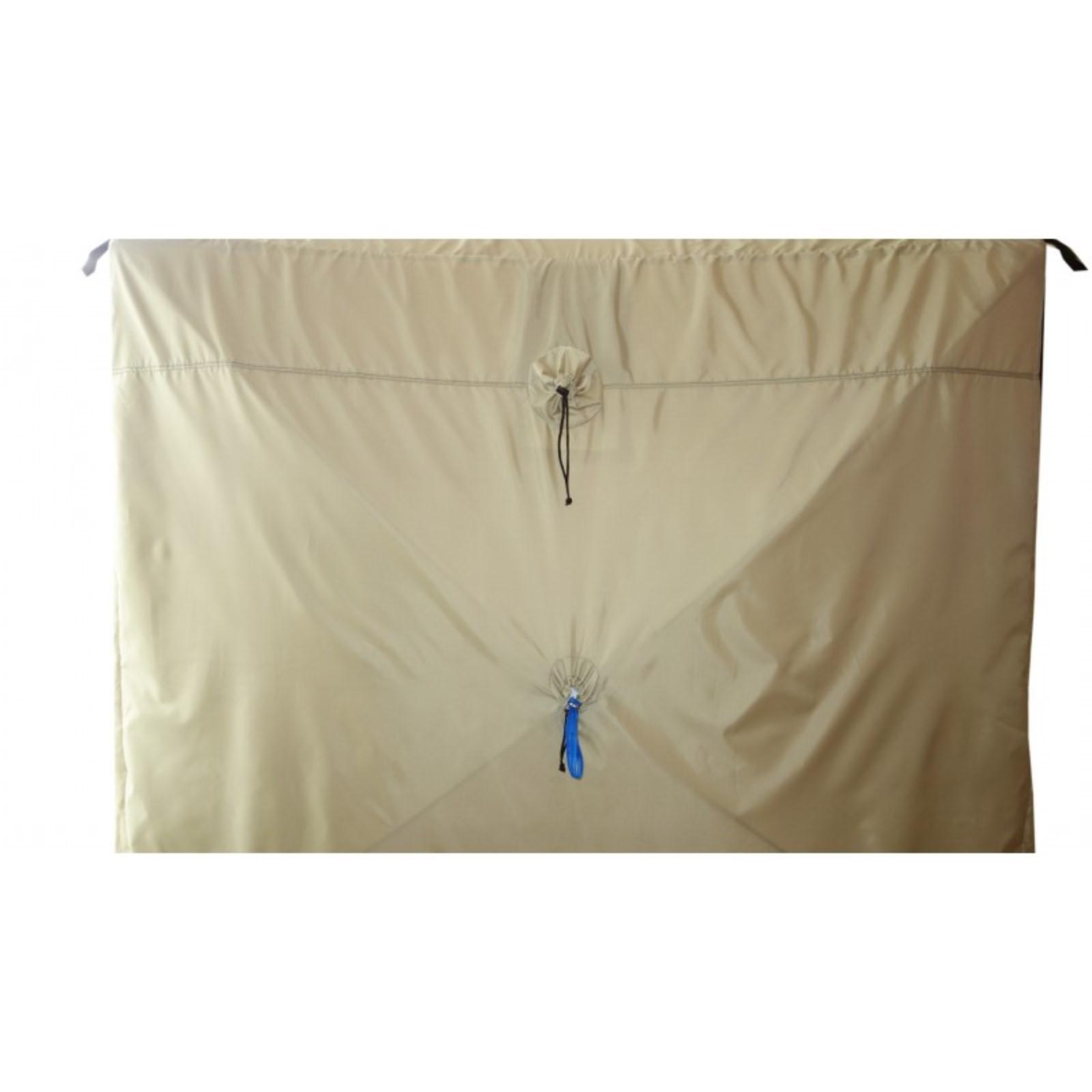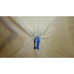 В местах, где находятся оттяжки и расположено окно, имеются затяжные шнурки с фиксаторами. У внутренних стоек вверху предусмотрены карманы под оттяжки. Таким образом, Вы можете максимально закрепить Ваше укрытие, используя дополнительно растяжки и колышки.