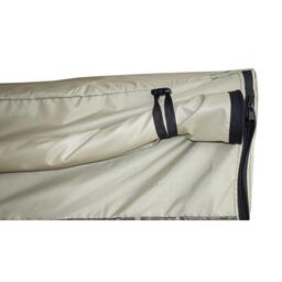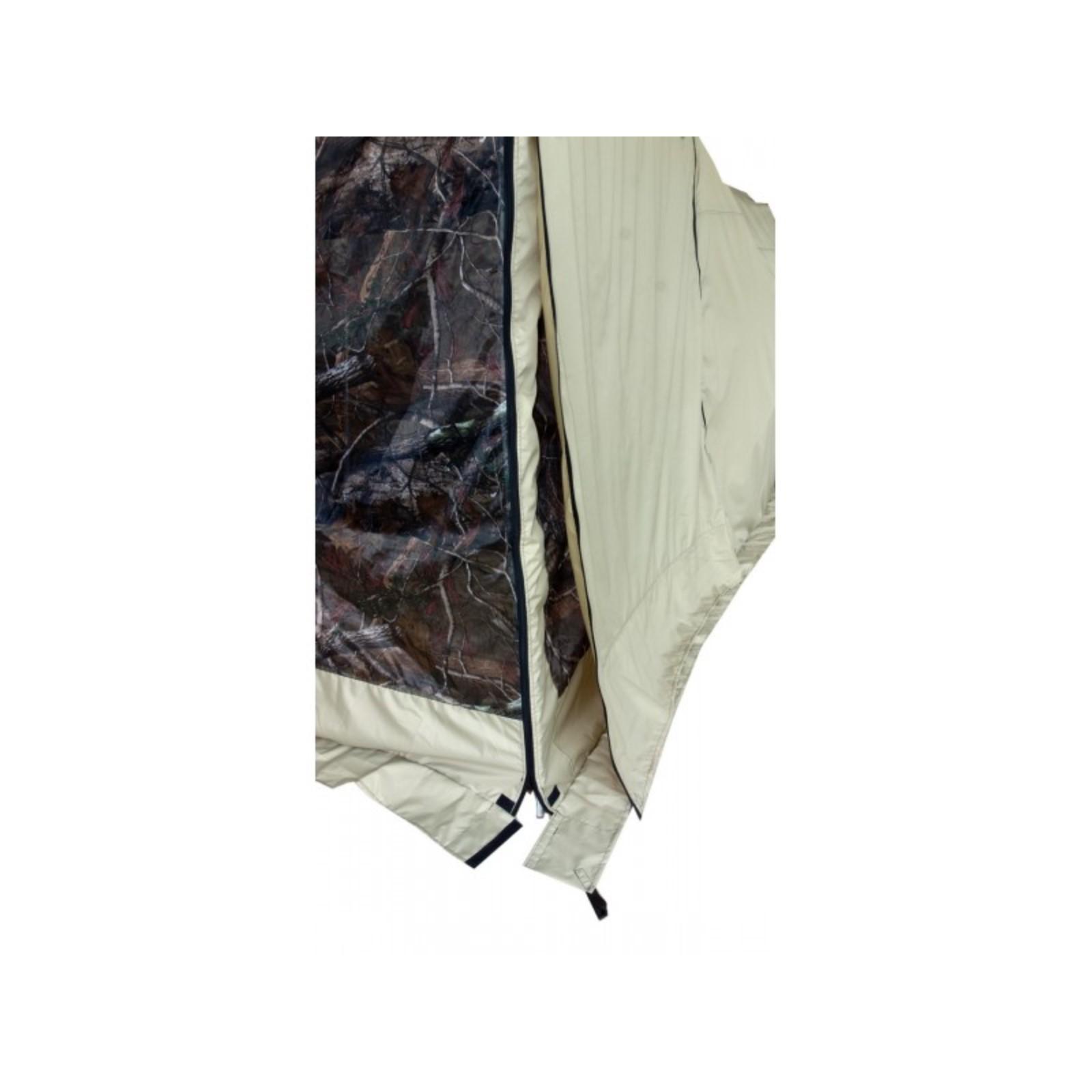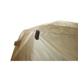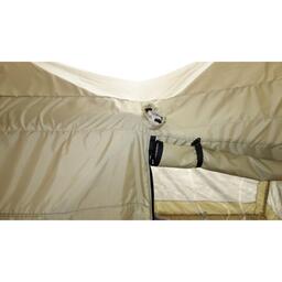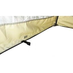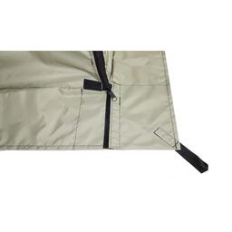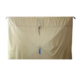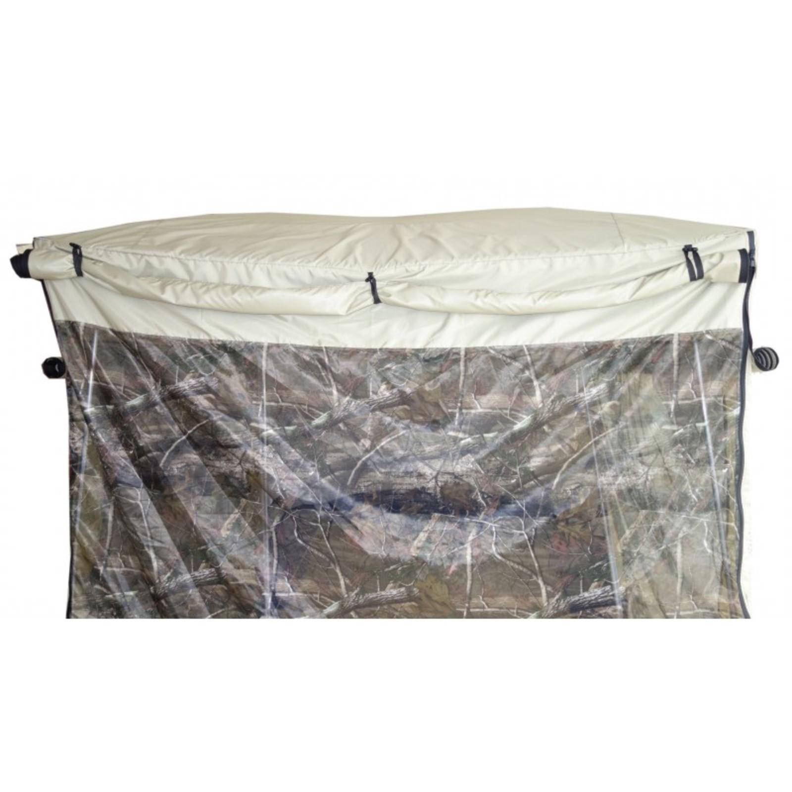 Изготавливается Навес из материала Оксфорд с плотностью плетения - 240 и полиуретановой пропиткой (PU 2000), и москитной сетки на молнии. Поверх москитных сеток предусмотрены защитные клапаны от дождя. При необходимости их можно закрыть с помощью молний, либо закрепить в верхней части с помощью петель и пуговиц-клевант.
