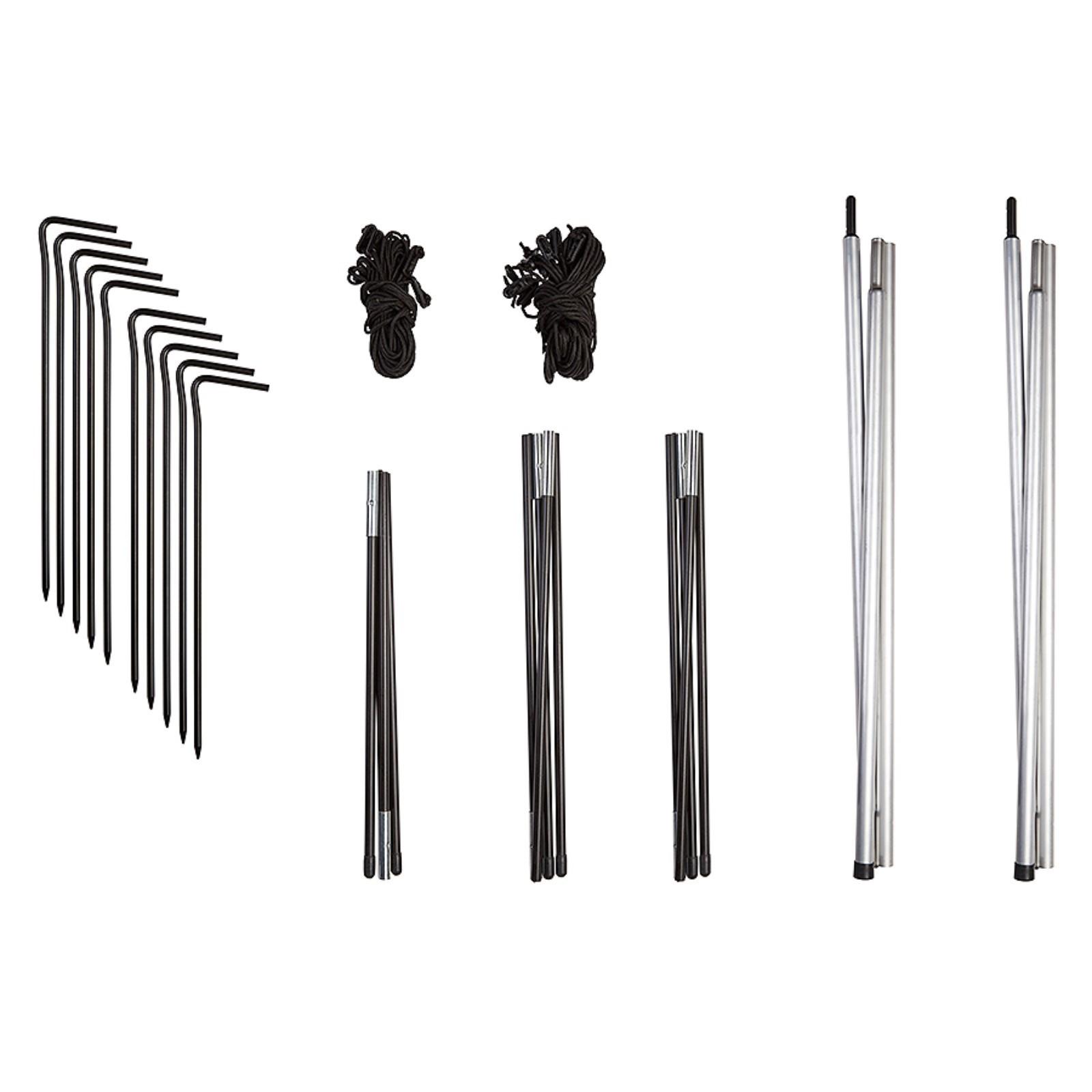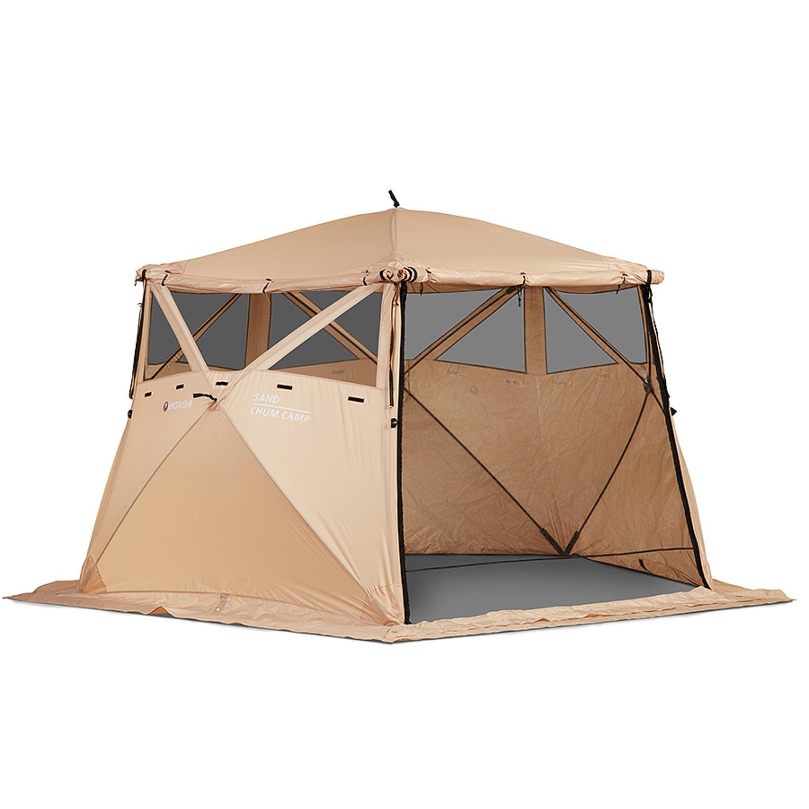 Трапециевидная кухня-шатер пятигранной формы Higashi Chum Camp Sand, цвет песочный. Оснащена четырьмя съемными карманами, стойками для установки солнцезащитного козырька, дополнительными усилениями по углам и по центральному потолочному хабу.