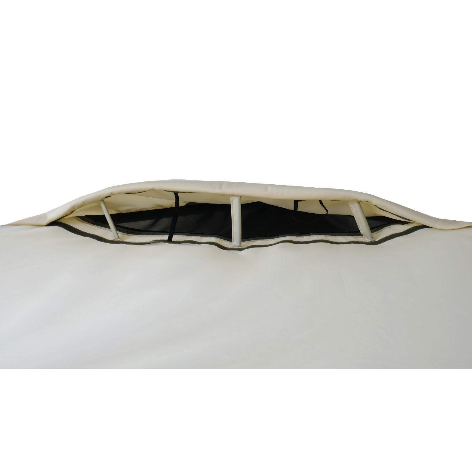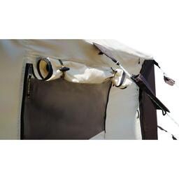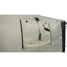 В крыше шатра-беседки есть вентиляционные окна, открываются 2 стороны друг напротив друга в 3 положения за счет специальных распорок. Материал тента позволяет выезжать в любую погоду: швы на крыше проклеены и показатели влагозащиты оптимальны благодаря материалу Oxford 240D 3000PU.