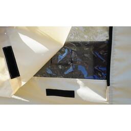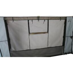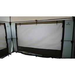 Так же удобно открывание основного входа, можно раскрыть полностью или половину. 2 стены шатра-беседки оснащены смотровыми окнами, друг напротив друга. Максимально удобное открывание стенок благодаря двустороннему бегунку на двойных молниях. В коньке шатра-беседки установлена специальная площадка с перфорацией для подвешивания крючков освещения, средств защиты от насекомых и любых других задач. В углах, есть возможность закрепить веревку для вывешивания вещей, достаточно протянуть ее по диагонали.