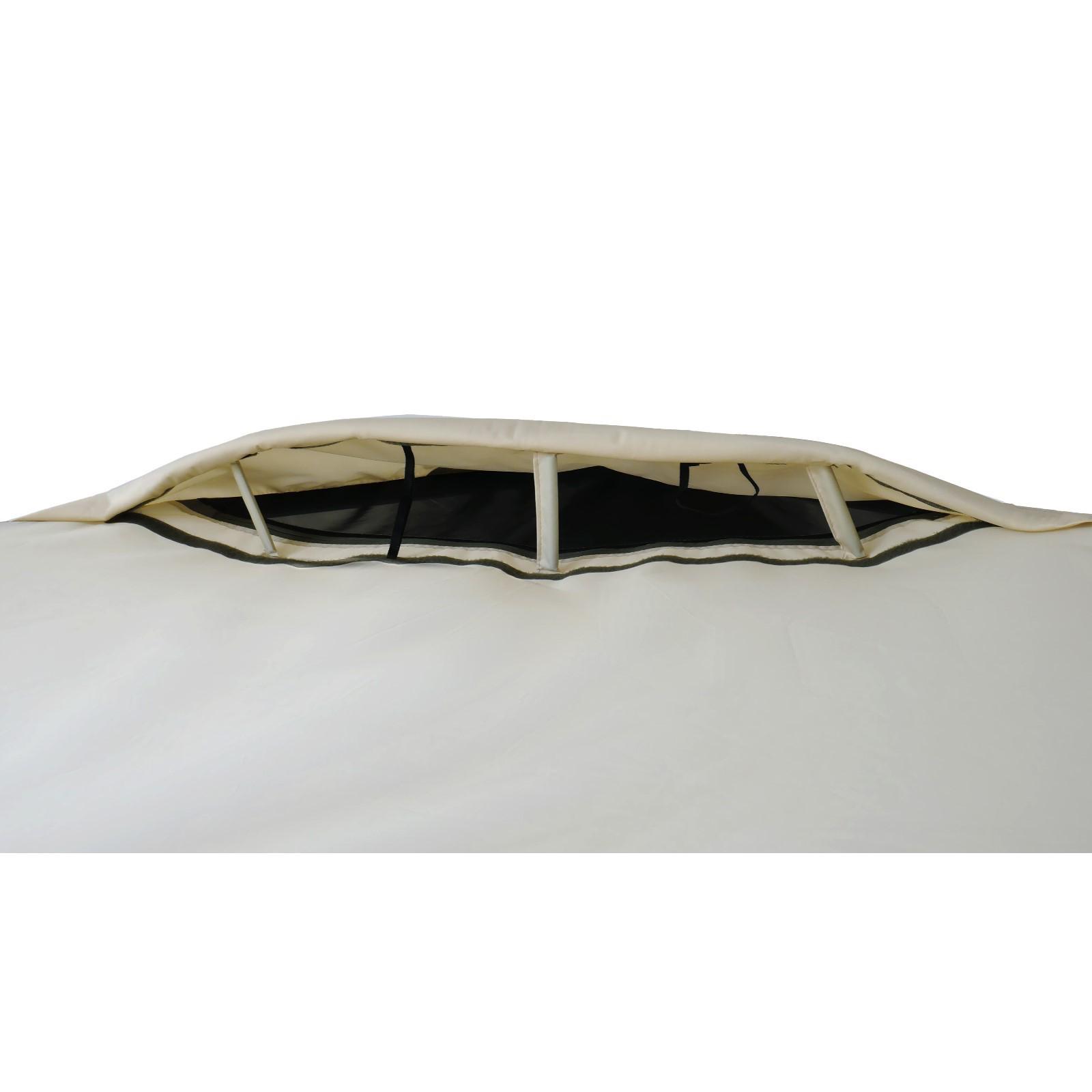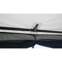 В коньке шатра-беседки установлена специальная площадка с перфорацией для подвешивания крючков освещения, средств защиты от насекомых и любых других задач. В углах, есть возможность закрепить веревку для вывешивания вещей, достаточно протянуть ее по диагонали. В крыше шатра-беседки есть вентиляционные окна, открываются 2 стороны друг напротив друга в 3 положения за счет специальных распорок. Материал тента позволяет выезжать в любую погоду: швы на крыше проклеены и показатели влагозащиты оптимальны благодаря материалу Oxford 240D 3000PU.
