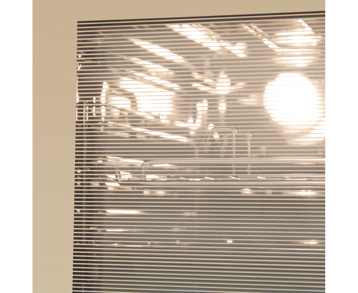 Дверца с доводчиком состоит из 3-х стекол, что создает холодный фронт и делает процесс приготовления безопасным, исключая возможность ожога при касании.