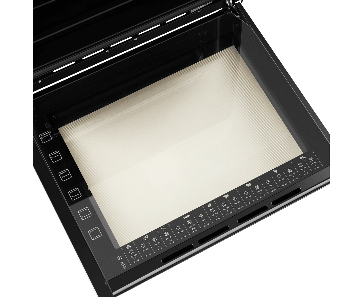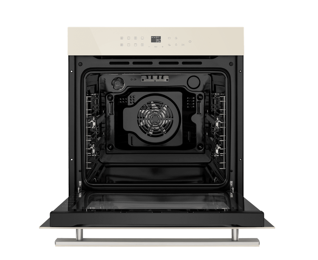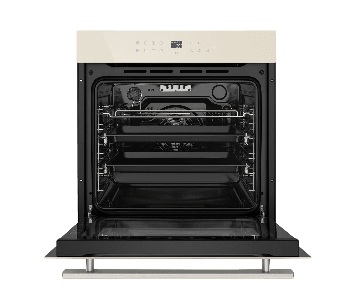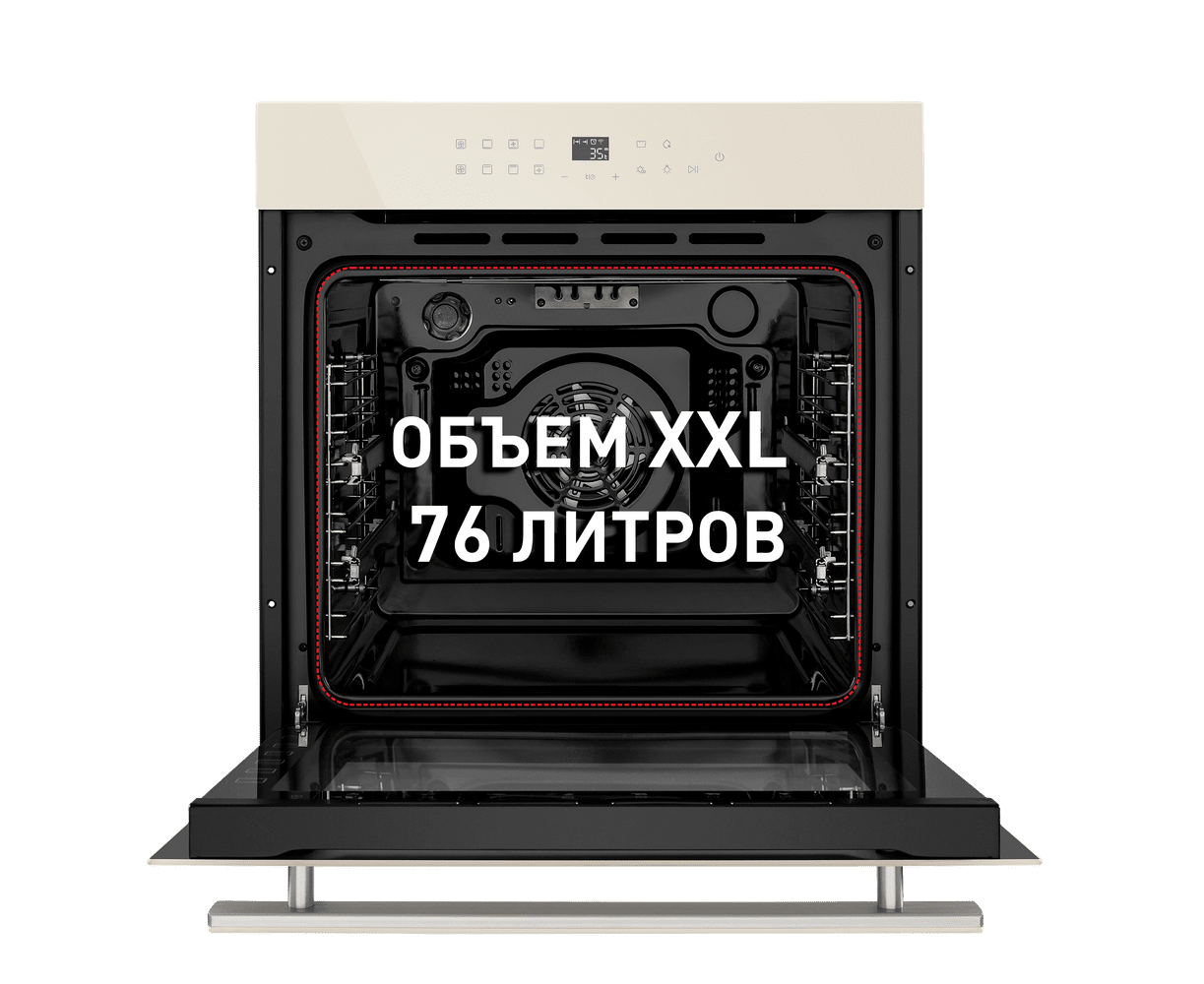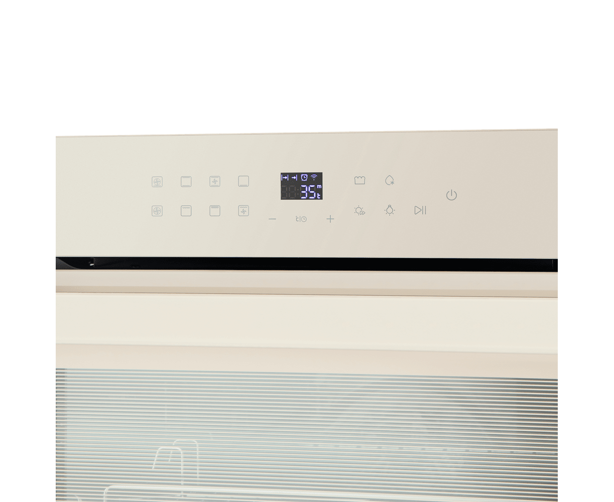 Фронтальная панель дверцы, лицевая часть блока управления и фасад ручки дверцы сделаны из высококачественного жаропрочного стекла бежевого цвета, окрашенного по всему объему, что является отличительной чертой бытового прибора премиум-класса.