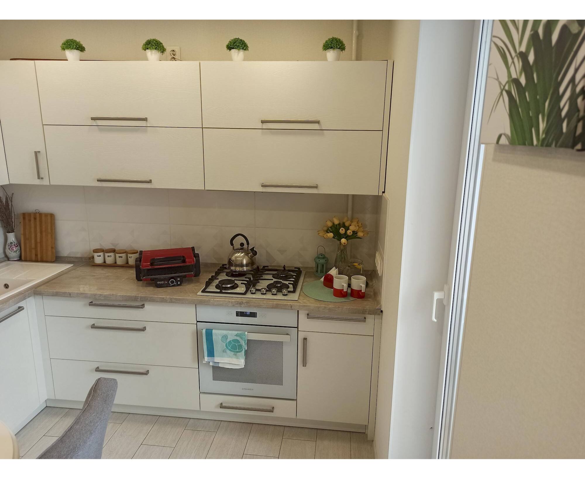 Фронтальная панель дверцы, лицевая часть блока управления и фасад ручки дверцы сделаны из высококачественного жаропрочного стекла бежевого цвета, окрашенного по всему объему, что является отличительной чертой бытового прибора премиум-класса.