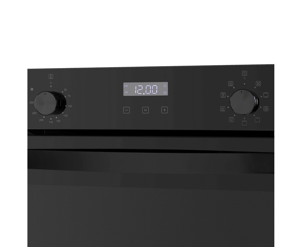 Комбинированное управление реализовано в виде сенсорного дисплея и поворотных ручек. Можно выбрать режим работы, температуру (50°-250°C), установить таймер и блокировку от детей. В данной модели есть 10 режимов: традиционный нагрев, большой гриль, конвекционный нагрев, малый гриль, разморозка, конвекция с нижним нагревом, горячий воздух, пицца, объемный турбогриль, освещение.