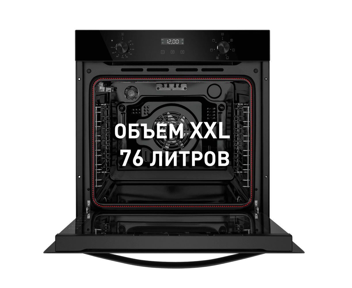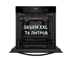 Объем 76 л при стандартных размерах 60 см позволяет готовить одновременно несколько блюд, разместив решетку или противень на одном из 6 уровней боковых направляющих. Внутреннее покрытие камеры выполнено из специальной легкоочищающейся эмали черного цвета.