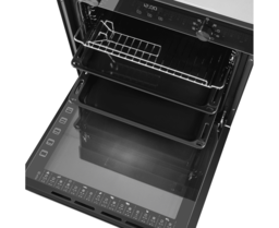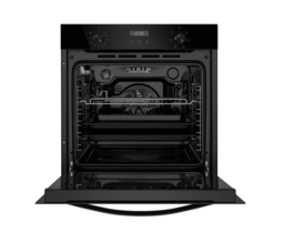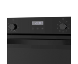 Фронтальная панель духовки изготовлена из высококачественного жаропрочного тонированного стекла черного цвета. Цельнометаллическая фурнитура (ручки управления и ручка дверцы), выполненная в черном цвете, не нагревается в процессе готовки.