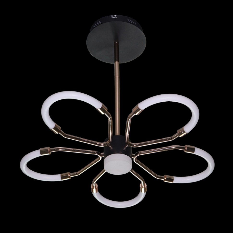 Высококачественный LED светильник в современном стиле. Данная люстра имеет исключительный дизайн, выполненный с учётом актуальных трендов. Лицевая сторона представляет собой пять направляющих в золотом цвете со светодиодными рассеивателями света, благодаря которым свет распределяется равномерно. Основание также выполнено в чёрно-золотом сочетании, добавляя роскоши. Общая мощность лампы 84 Ватт. Светодиодная люстра может осветить до 17 метров2. Она проста в сборке, установке и экономична в обслуживании. Подойдёт для всех видов потолков. Степень защиты 20 IP. Светодиодные ленты и платы легко заменимы в случае перегорания. Состав: Металл, Акрил, пластик. Световой поток 7560 lm.