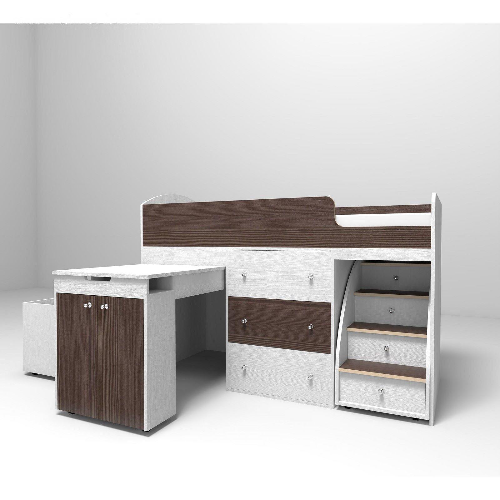 Спальное место ограждено бортиком и надёжными спинками для защиты от падений во сне. Выкатной столик предназначен для компьютера и прочей аппаратуры. Комод с тремя выдвижными ящиками станет подходящим местом для хранения одежды, белья и прочего текстиля. Выдвижная лестница, помимо своего прямого назначения, имеет несколько ящиков. В них вы сможете убрать коробки с обувью, книги и другие предметы. В наборе также имеется деревянный пуфик.