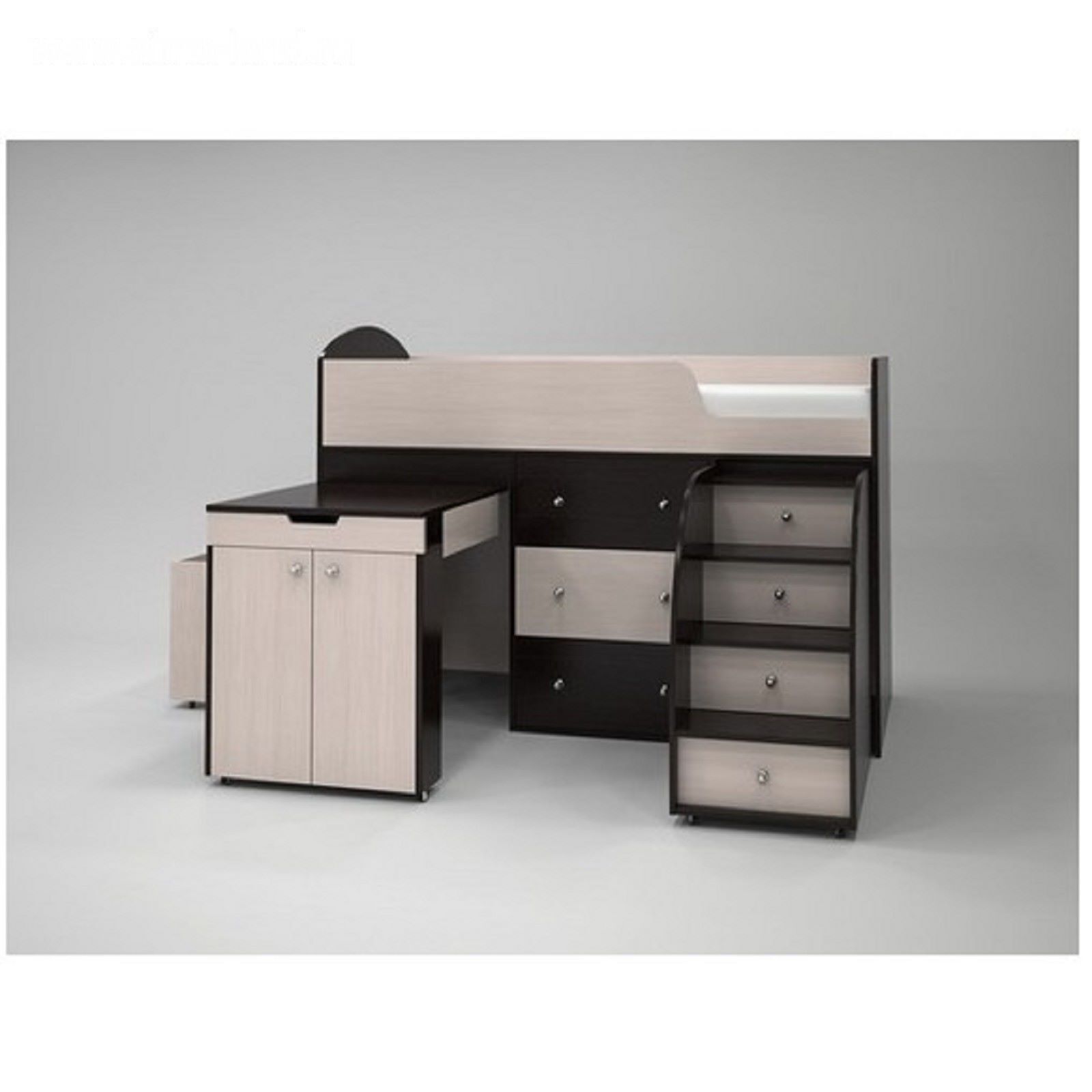 Спальное место ограждено бортиком и надёжными спинками для защиты от падений во сне. Выкатной столик предназначен для компьютера и прочей аппаратуры. Комод с тремя выдвижными ящиками станет подходящим местом для хранения одежды, белья и прочего текстиля. Выдвижная лестница, помимо своего прямого назначения, имеет несколько ящиков. В них вы сможете убрать коробки с обувью, книги и другие предметы. В наборе также имеется деревянный пуфик.