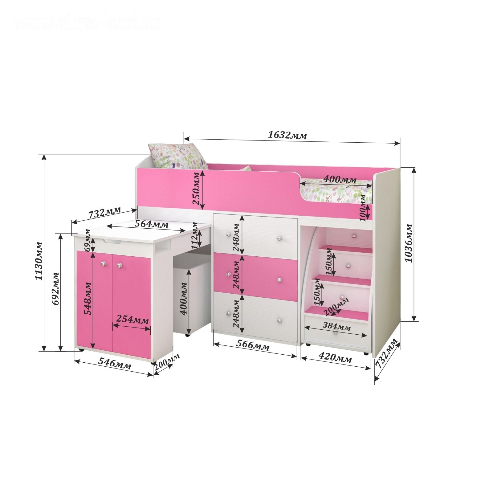 Спальное место ограждено бортиком и надёжными спинками для защиты от падений во сне. Выкатной столик предназначен для компьютера и прочей аппаратуры. Комод с тремя выдвижными ящиками станет подходящим местом для хранения одежды, белья и прочего текстиля. Выдвижная лестница, помимо своего прямого назначения, имеет несколько ящиков. В них вы сможете убрать коробки с обувью, книги и другие предметы. В наборе также имеется деревянный пуфик.
