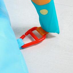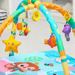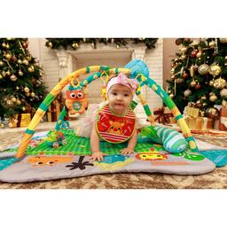 Малыш играет на спинке лёжа. На самом раннем этапе своего развития малыш тянется за яркими, притягивающими внимание игрушками и учится их хватать, так же малыш видит свое отражение в безопасном зеркальце и улыбается. В комплекте с ковриком прилагаются подвесные игрушки, яркие и привлекательные, они служат для развития тактильных ощущений и зрения.