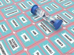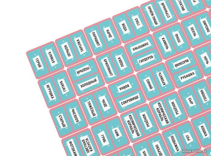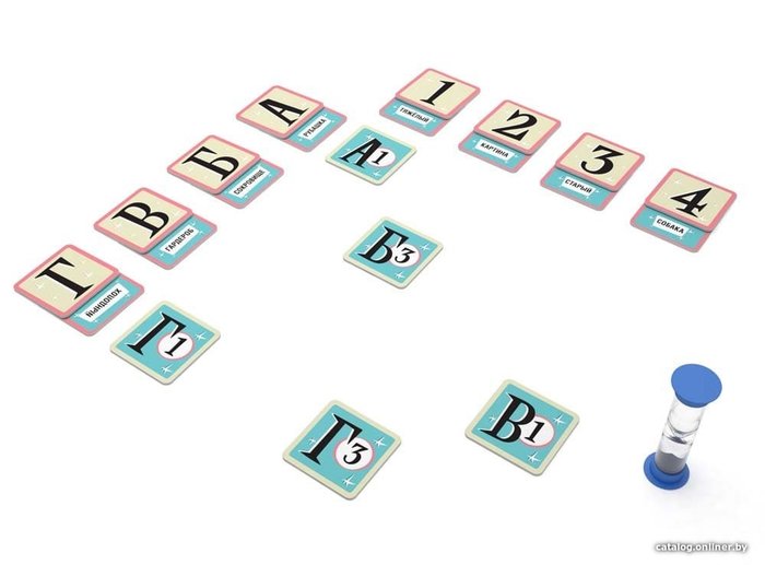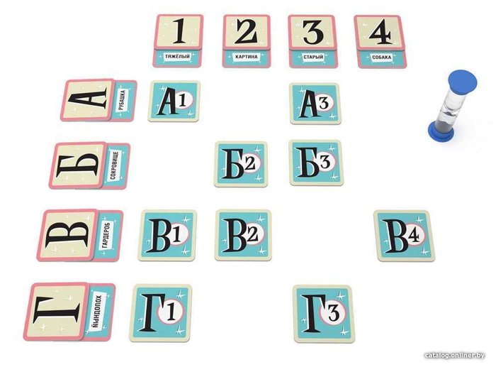 • Комплектация 10 тайлов с координатами; 25 карточек с подсказками; 50 карточек с кодовыми словами; 1 песочные часы примерно на 5 минут; правила игры.