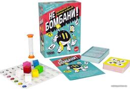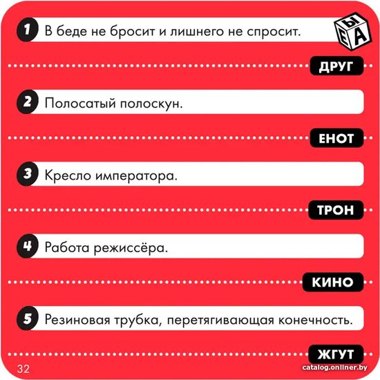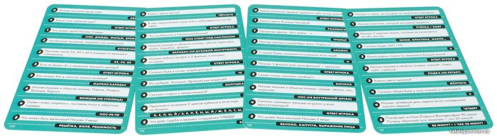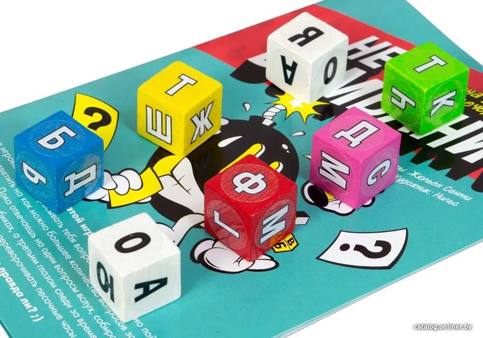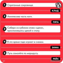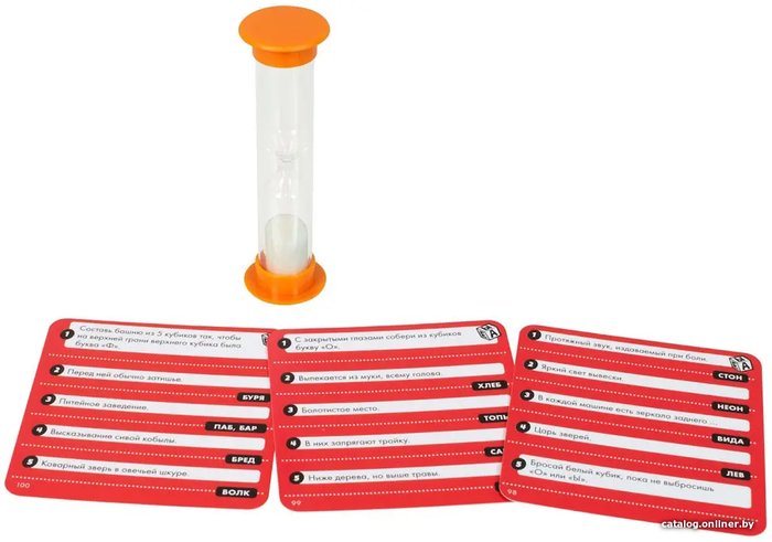 Комплектация50 голубых карт (1000 вопросов)50 красных карт (500 вопросов)7 кубиковлист наклеек с буквамипесочные часы (на 30 секунд)карта для песочных часовправила игры