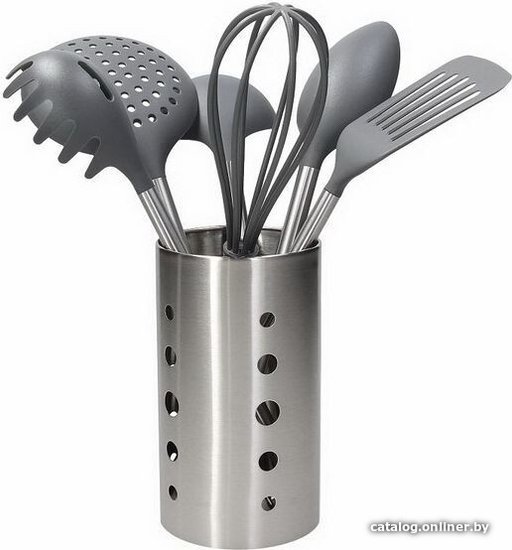 - Состав набора венчик, ложка, ложка для спагетти, лопатка, подставка, половник, шумовка
