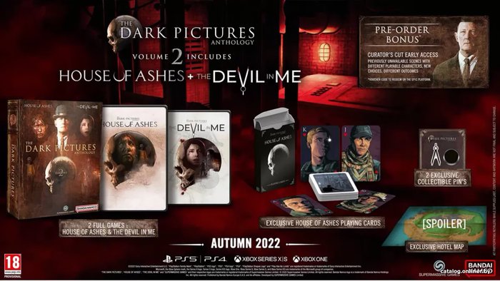 В комплектеКоробка лимитированного издания.- 1 Blu-Ray диск с игрой The Dark Pictures Anthology: The Devil In Me в пластиковом боксе.- 1 Blu-Ray диск с игрой The Dark Pictures Anthology: House Of Ashes в пластиковом боксе.- Эксклюзивные игральные карты House Of Ashes.- 2 эксклюзивных коллекционных значка.Цифровой контент:- Эксклюзивная карта отеля.