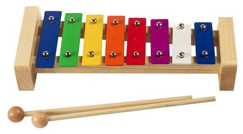 Металлофон - ударный музыкальный инструмент, является одной из разновидностей ксилофонов. Представляет собой ряд металлических пластин, настроенных на определённые ноты, по которым ударяют палочками. Обладает ярким, чистым звуком. Инструмент может использоваться как соло, так и в ансамбле. Металлофон поможет развить музыкальный слух ребенка, чувство ритма, и при этом настолько легок в применении, что даже у малыша, не владеющего нотами, обязательно получится мелодия. Данная модель имеет 8 разноцветных металлических пластинок, на каждой указана соответсвующая ей нота, в комплекте прилагается деревянная палочка для игры.