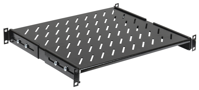 Стационарные полки рассчитаны на тяжелое оборудование с постоянным статичным размещением, крепятся как на фронтальные, так и на задние профили, имеют перфорированную поверхность для обеспечения лучшего охлаждения и отведения теплых воздушных потоков. Ушки, с помощью которых полки крепятся к монтажным профилям, могут регулироваться спереди и сзади в пределах 50 мм, что позволяет увеличить глубину полки на 100 мм и упрощает ее установку внутри шкафа.