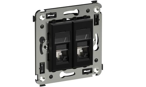 Компьютерная розетка RJ-45 в стену, двойная. Категория: 5e. Предназначена для монтажа в подрозеточные коробки глубиной не менее 45 мм (код 59301); подключение сетевого кабеля к рабочему месту. Характеристики: 8P8C; пылезащитной шторкой; с маркировочной табличкой; возможность заделки без инструмента. Цвет: Черный матовый.
